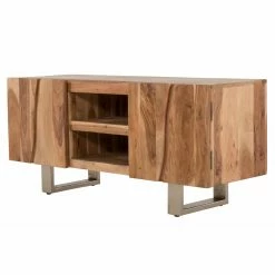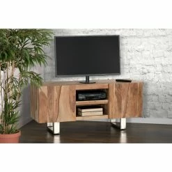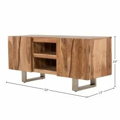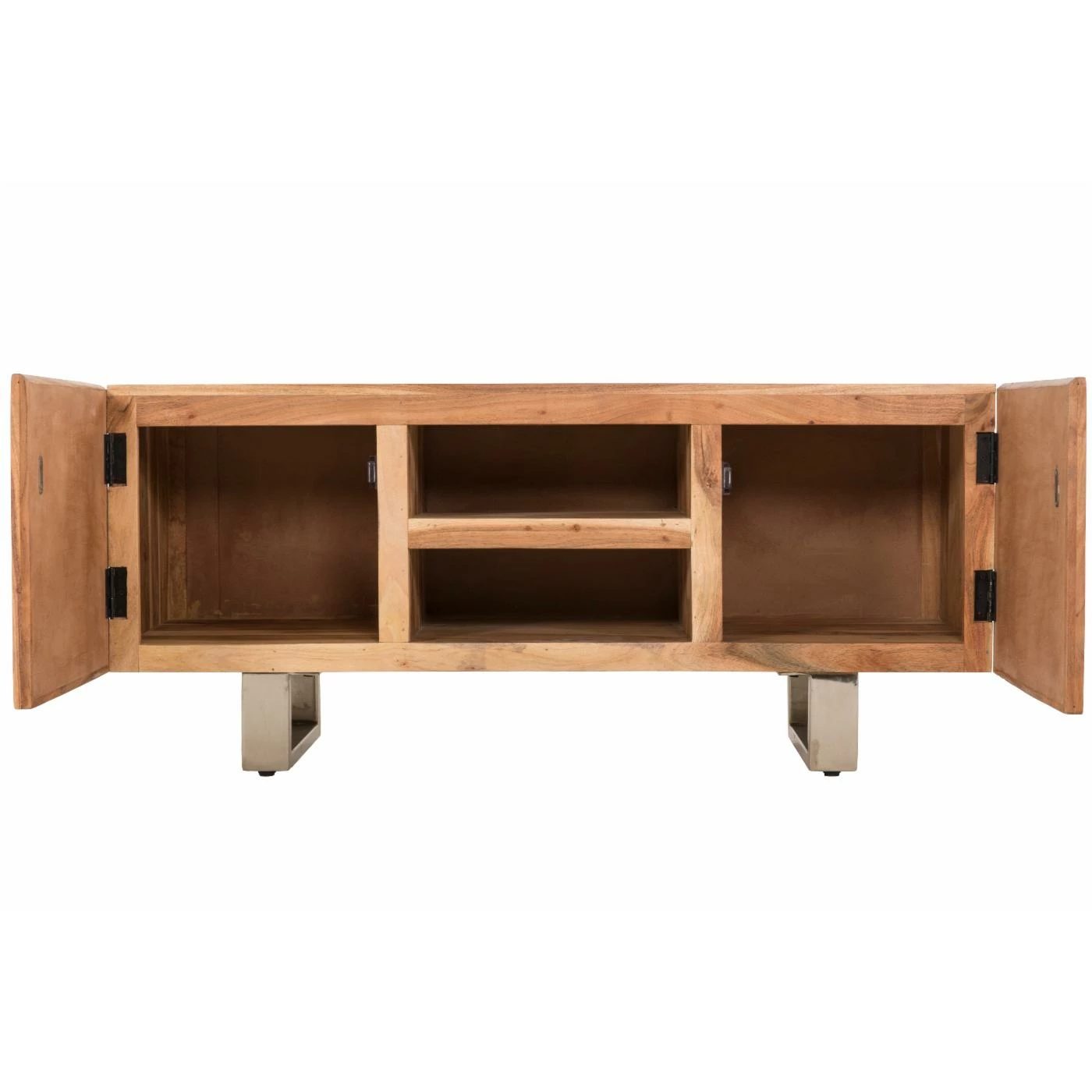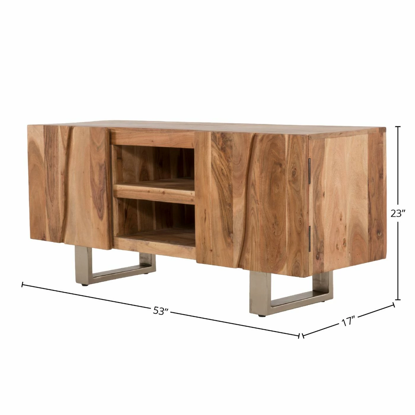The Josie TV Console is made of acacia wood with an iron base ensuring wear and tear resistance and durability. With its natural wood imperfections, this contemporary TV console makes for an excellent rustic addition to your living room setting. Its features include two hinged doors, two shelves for storage, and cable management capabilities to conveniently store your entertainment goods.