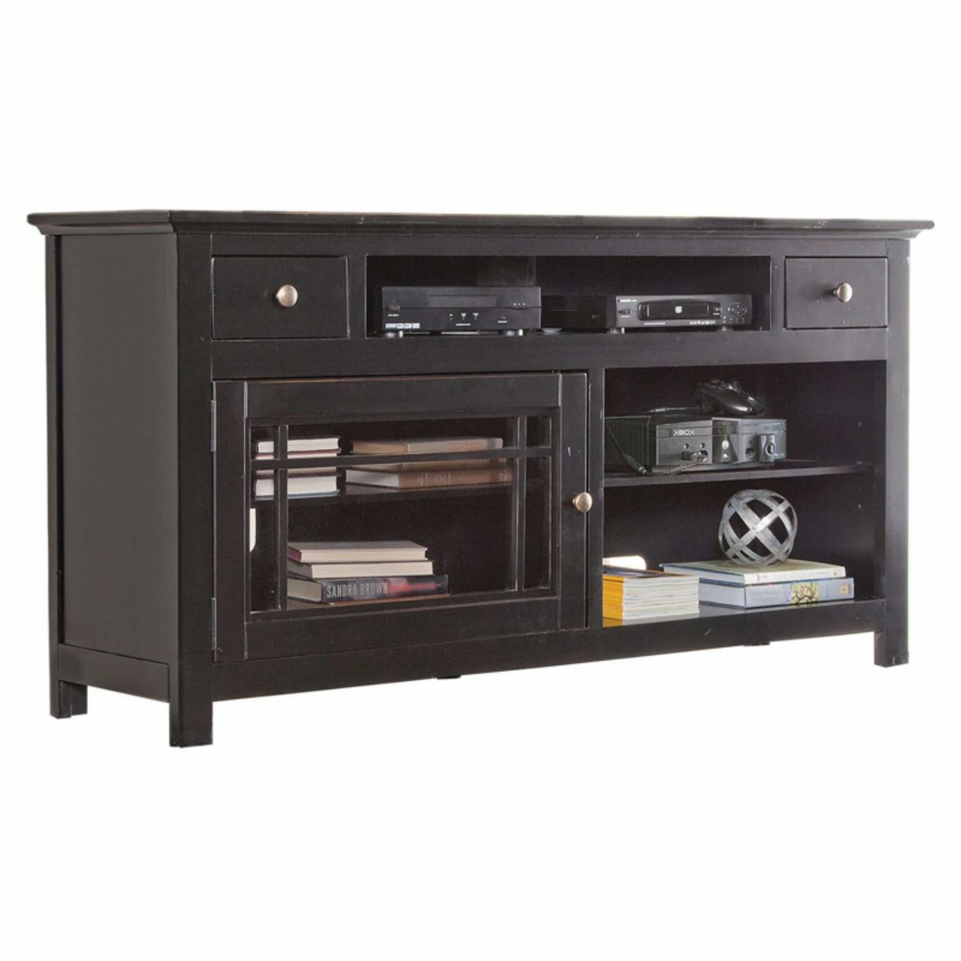 Youโll have no trouble organizing your living room with the Progressive Furniture Emerson Hills 64 in. TV Console. Boasting ample storage space, a transitional design, and the ability to accommodate most TV screens up to 63.5 inches as well as most sound bars, this TV console is a must-have for any home. Two small drawers are ideal for holding remotes while the center and side compartment are perfect for holding media devices, game consoles, and decorative items. Use the large glass cabinet to keep your favorite DVDs and books within easy reach. Built-in grommets for wire management complete the design. Crafted from pine solids and veneers and with your choice of available hand-applied finishes, this piece will blend seamlessly with your current decor.