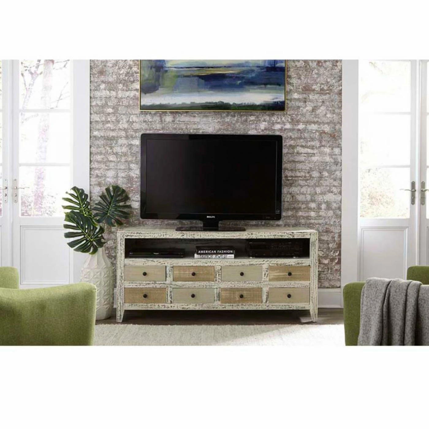 Show off your love of vintage style with the Progressive Furniture Mojave 61 in. Console TV Stand. Crafted from Brazilian pine solids with a natural, distressed finish that brings out the beauty of the contrasting wood front drawers, this TV stand is a stunning addition to any home. Its large open shelf is perfect for holding media devices and game consoles while the eight drawers offer ample storage space. This TV stand is able to fit most TV screens up to 65-inches wide and features cut-outs for easy wire management.