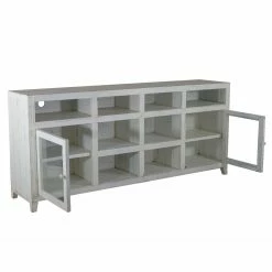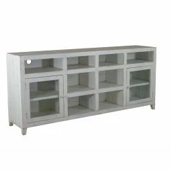 - Features two glass wooden framed doors with adjustable shelving behind and the balance is all stationary shelving