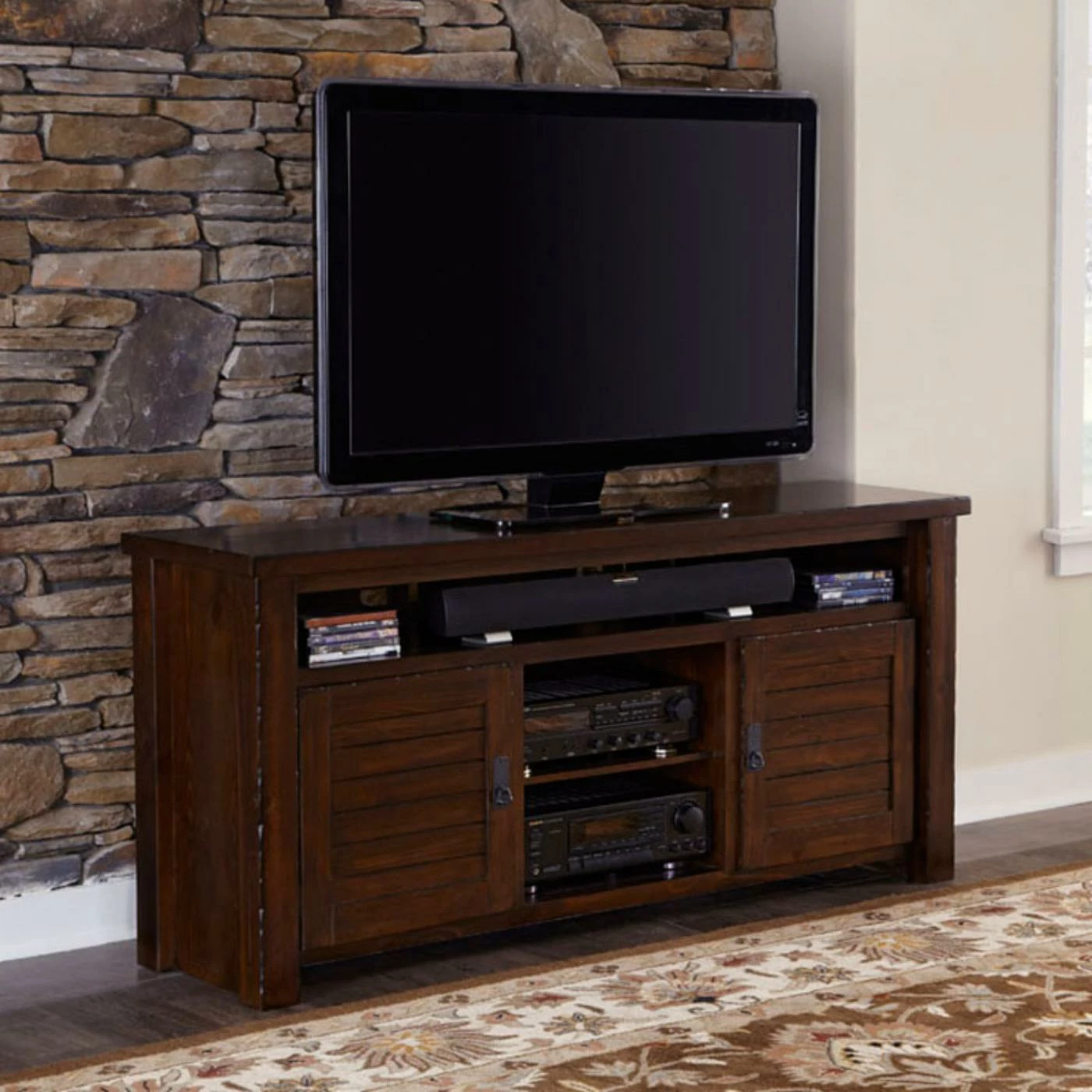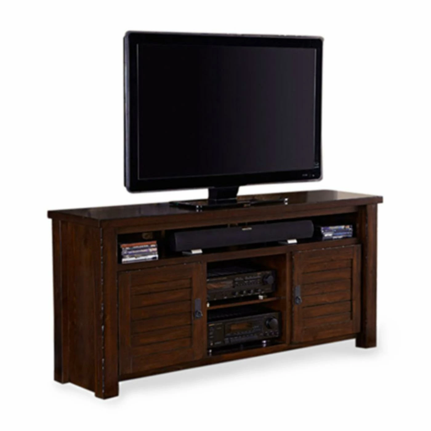 Fashionable and functional, the Progressive Furniture Trestlewood 64 in. TV Console – Mesquite PineΒ features a distressed, rustic finish that’s perfect for a mission-style space. This TV console is constructed of solid wood and veneers. It’s equipped with two slatted cabinet doors, each with a metal bail pull. An upper, full-length shelf and two center shelves provide space for display. It’s equipped with cord management cutouts for organization. Pair this console with other items from the the Trestlewood Colletion for a coordinated look.