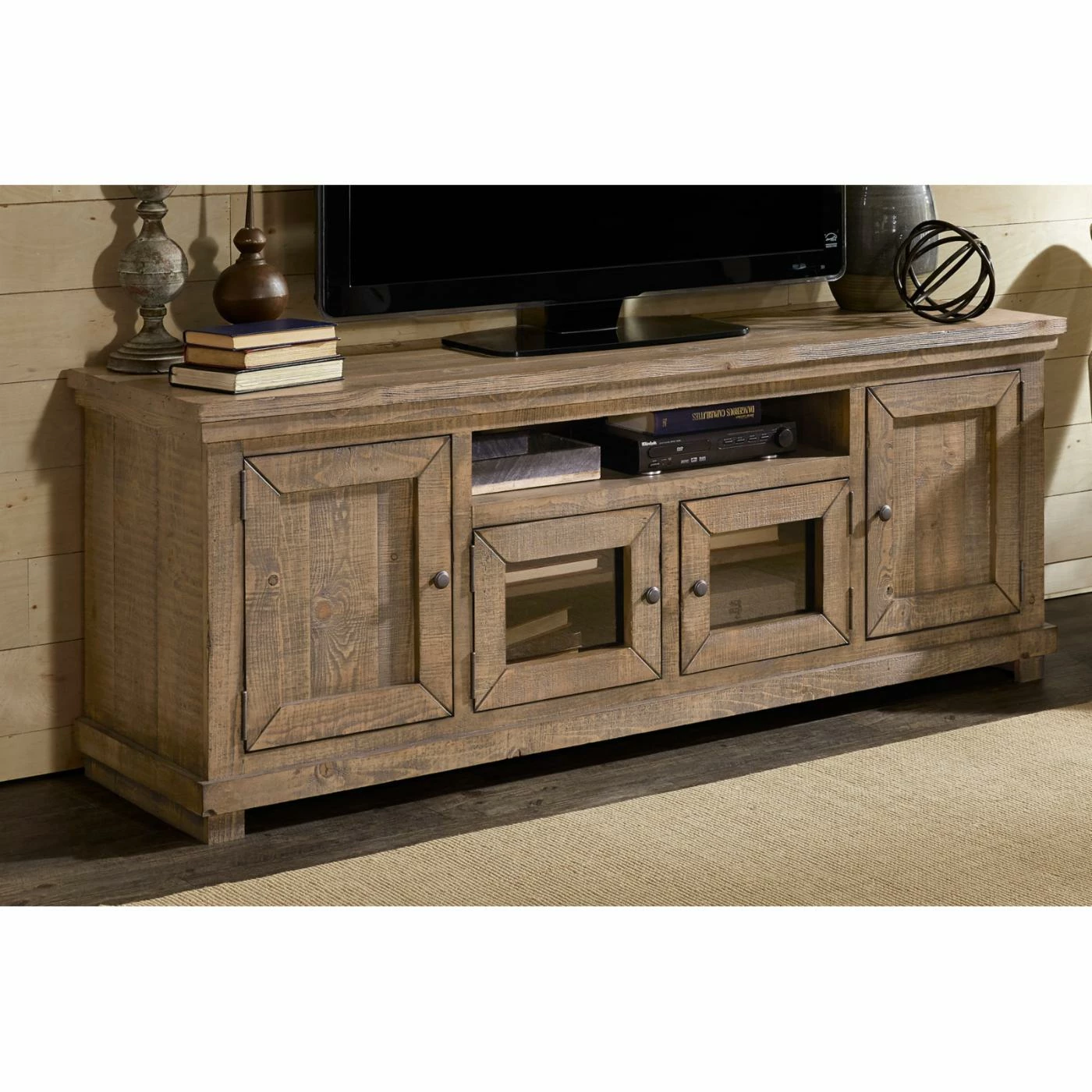 Even though the Progressive Furniture Willow 74 in. TV Console has the size and storage for even the largest of entertainment pieces, the gentle mix of color and texture gives it a light coastal feel that will add a refreshing style to your home. A finish of distressed and weathered gray adds the texture and color of reclaimed lumber. The simple design is accented by thick-paneled doors on the outside, and a pair of glass-paneled doors on the inside. Each door covers a roomy interior with adjustable shelves and cord access ports at the rear. An open shelf just below the top of the console is perfect for consoles or AV components, but it’s also a great place to put a sound bar. Metal door pulls are finished in a shade of gunmetal. The top of this console is wide enough to accommodate a flat-panel TV measuring up to 71 inches.