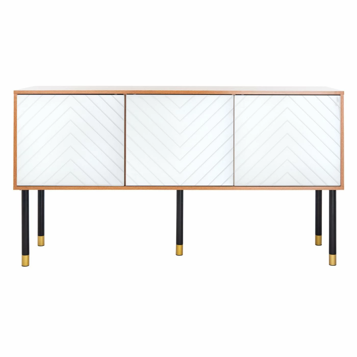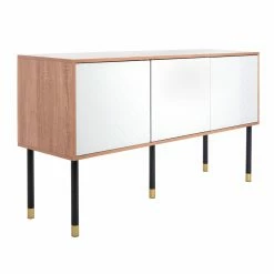 Designed with retro flair, this Safavieh Oakley TV StandΒ brings contemporary flair to vintage style. Perched on swanky black metal legs with brass caps, it hides clutter with ease, and its gorgeous natural and white wood top makes it ideal for displaying a flat screen.