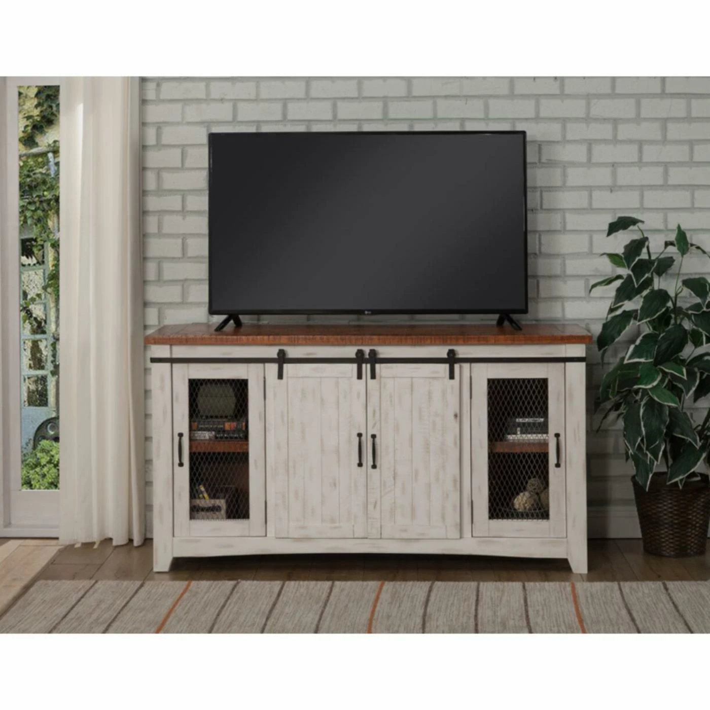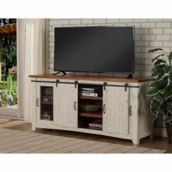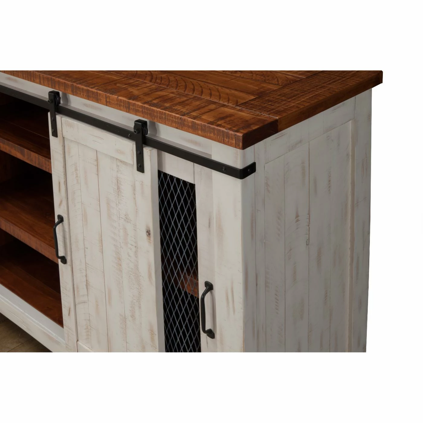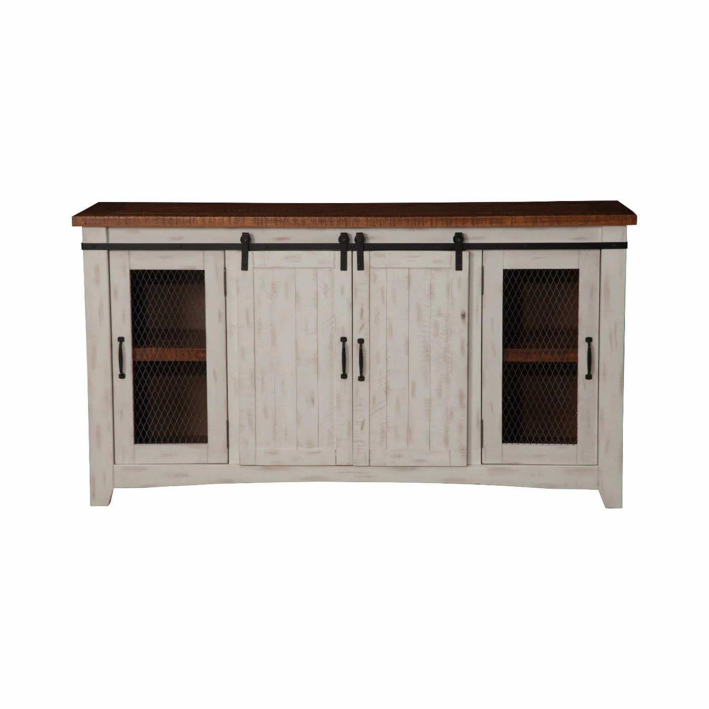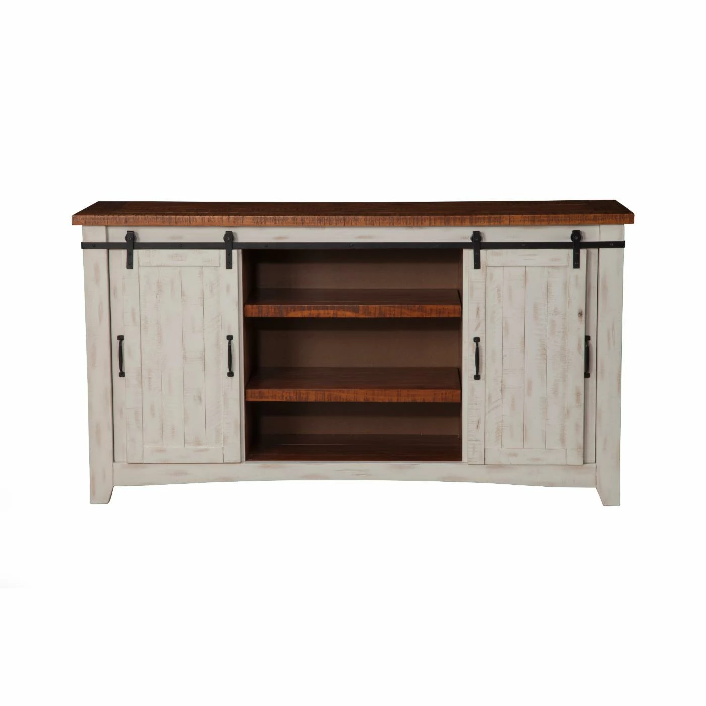 Bring the beauty of New Mexico into your home dรฉcor with the Sandberg Furniture Martin Svensson Home Taos 65 in. TV Stand. This ruggedly handsome hub is crafted from pine and pine wood veneers in a two-tone finish of antique white and aged, distressed pine to achieve that classic farmhouse look. The generous top is large enough to accommodate a 70 inch TV and there’s an anti-tip kit included for peace of mind – we know that HD screen was pricey! For storage, the Santa Fe offers two sliding barn style doors that glide on an all-black metal track. While the barn doors are all-wood, the two side doors showcase a metal mesh screen so that guests can look inside at your media collection or displayed antiques and collectibles. There are four interior shelves in total and they’re all removable and adjustable for your convenience. Some assembly is required.