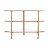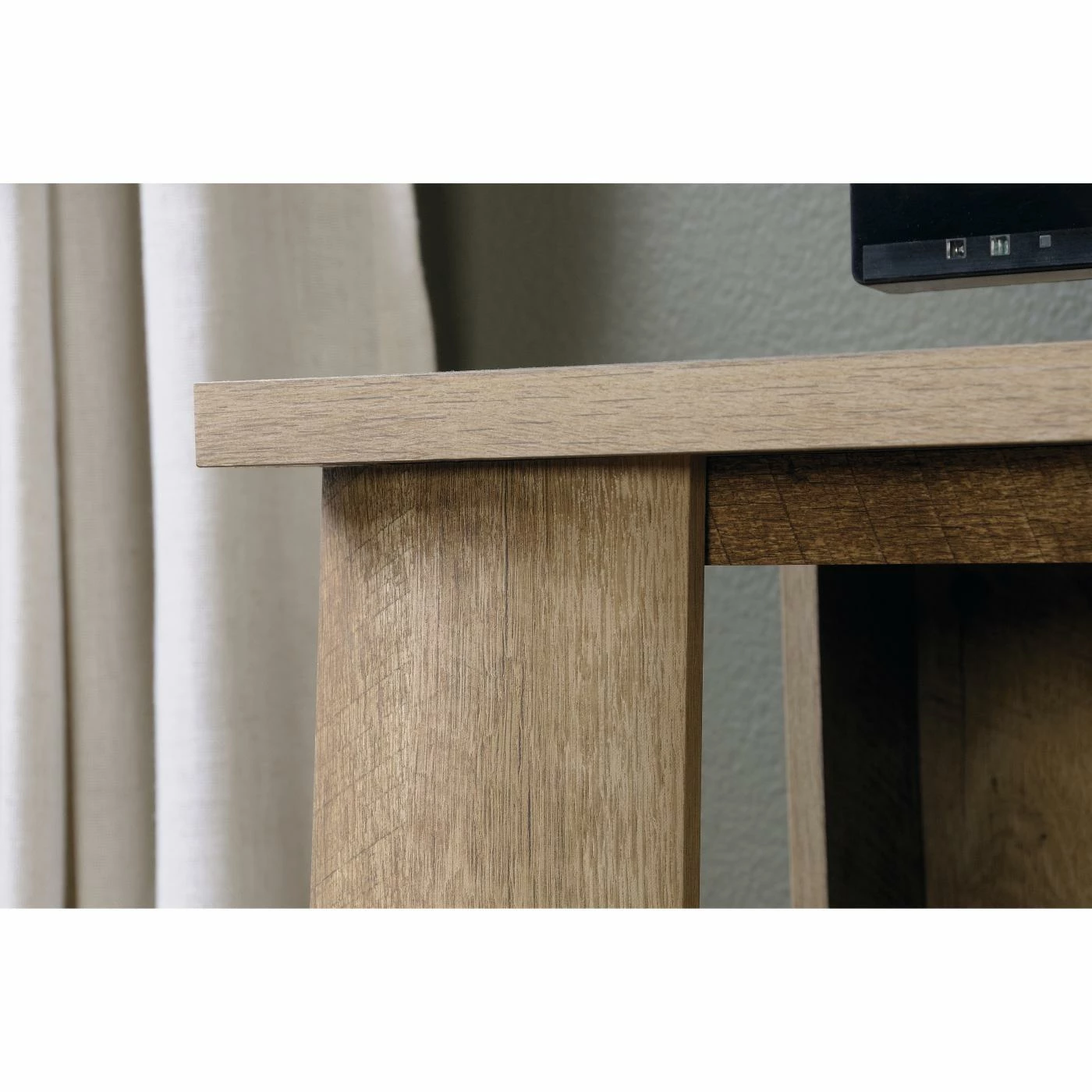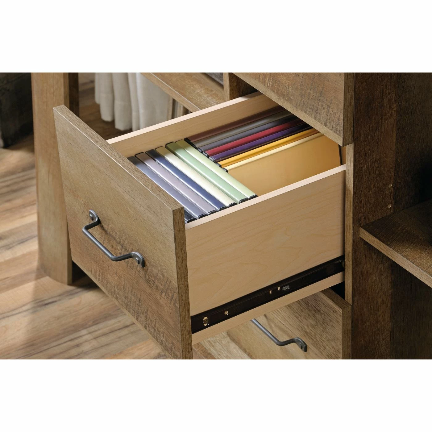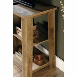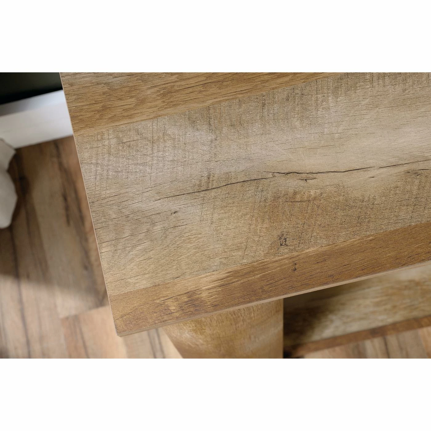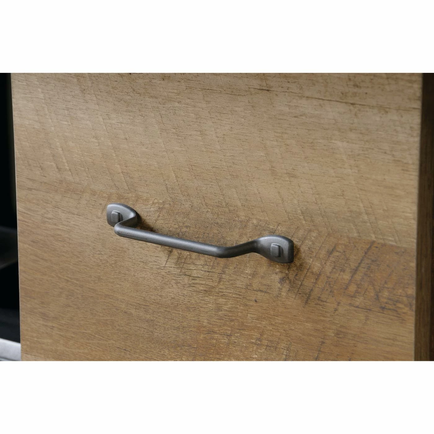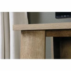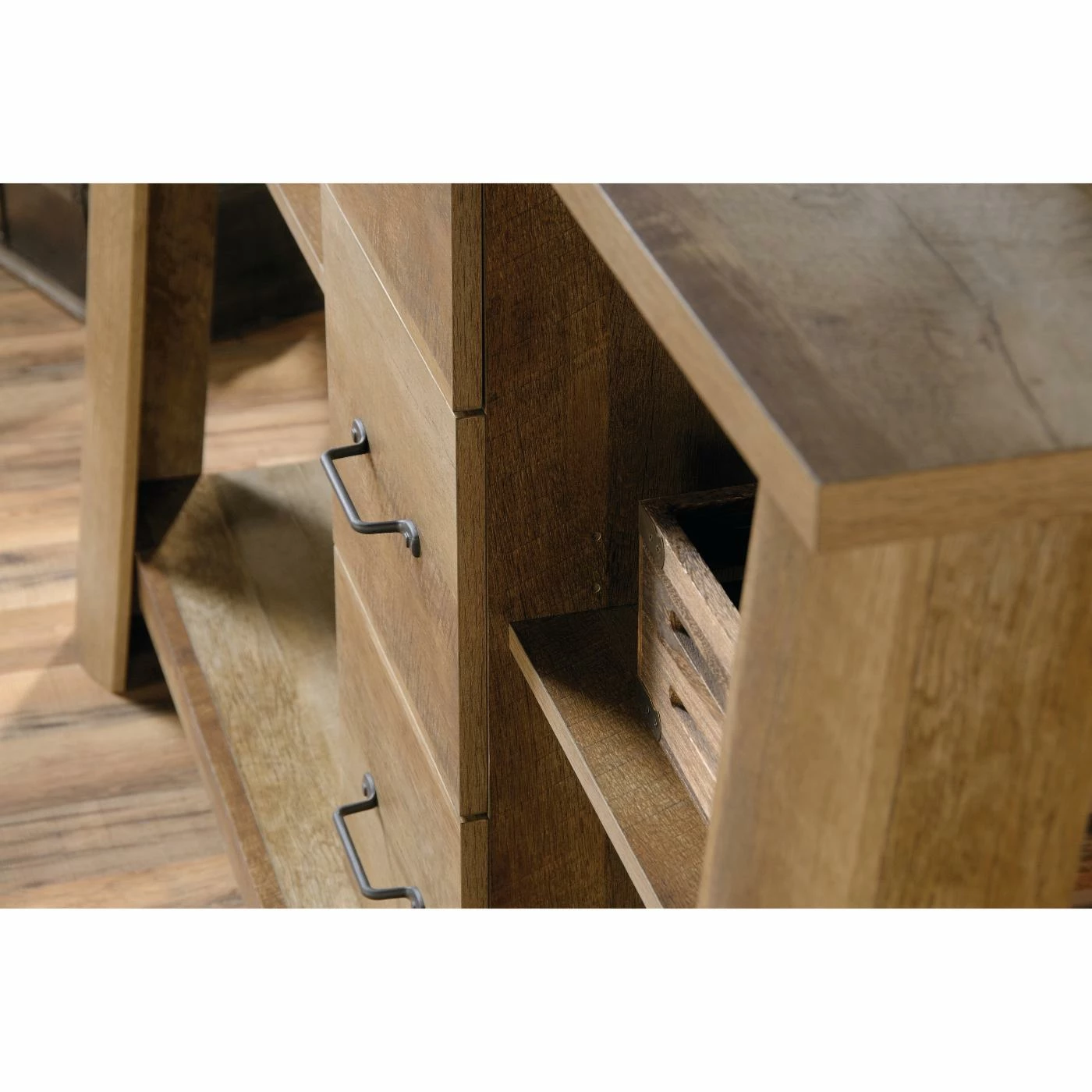 The Sauder Boone Mountain Credenza/TV Stand is a rustic design fashioned from thick cut logs and finished with a oaken hue. This piece will give your living area or bedroom a lodge-inspired look while still offering the display and storage space you need for your big flat screen, audio/visual components, and that impressive collection of movies, music, and games. The top can support up to a 65 inch TV or one weighing up to 95 lbs. The base is fitted with three generous drawers, which divide the open shelves at each side.