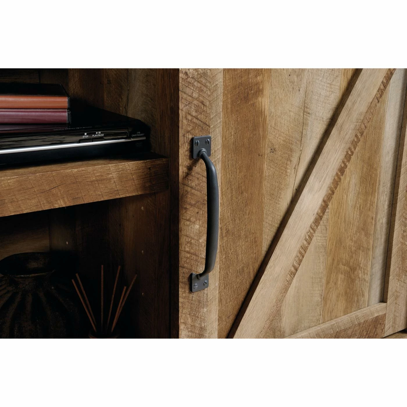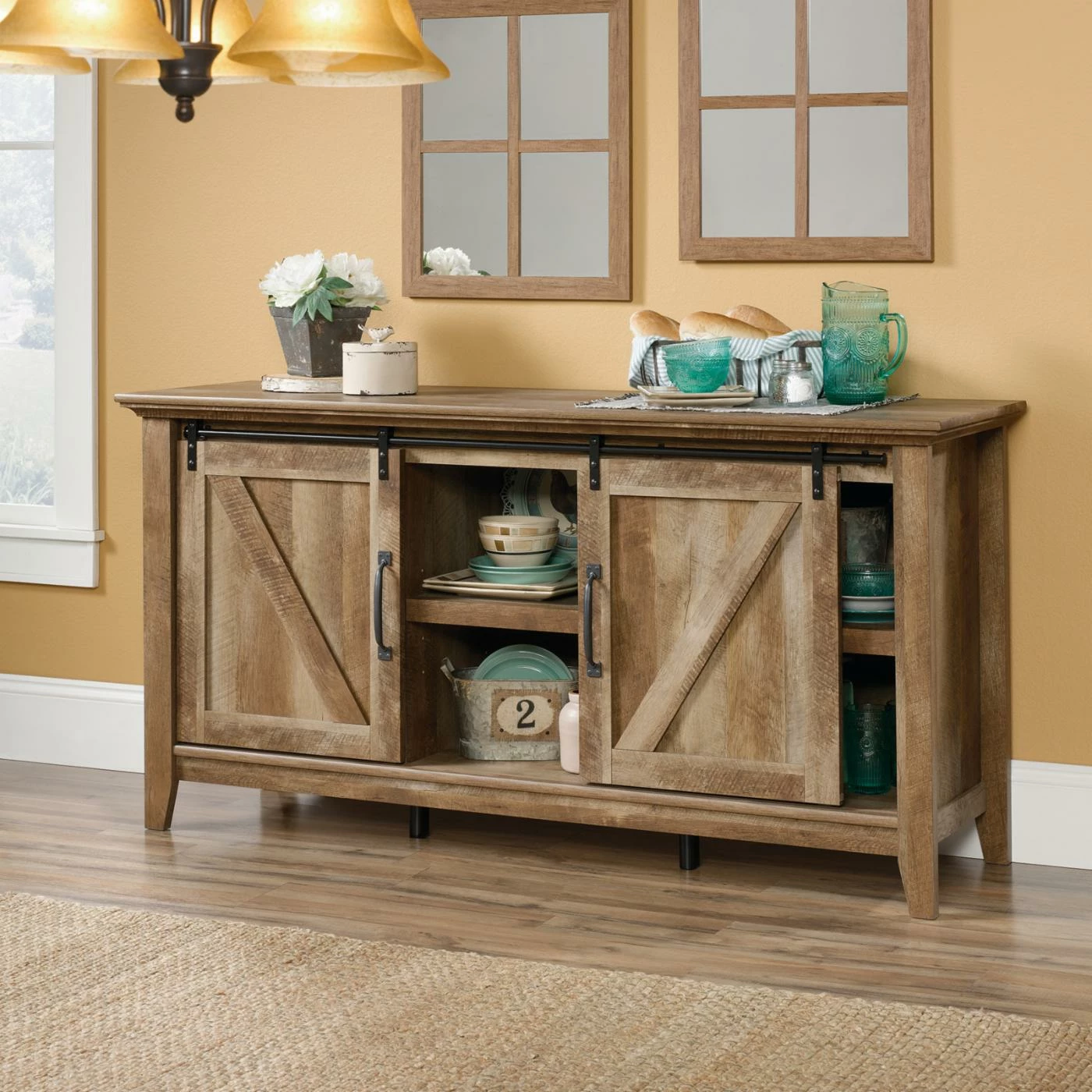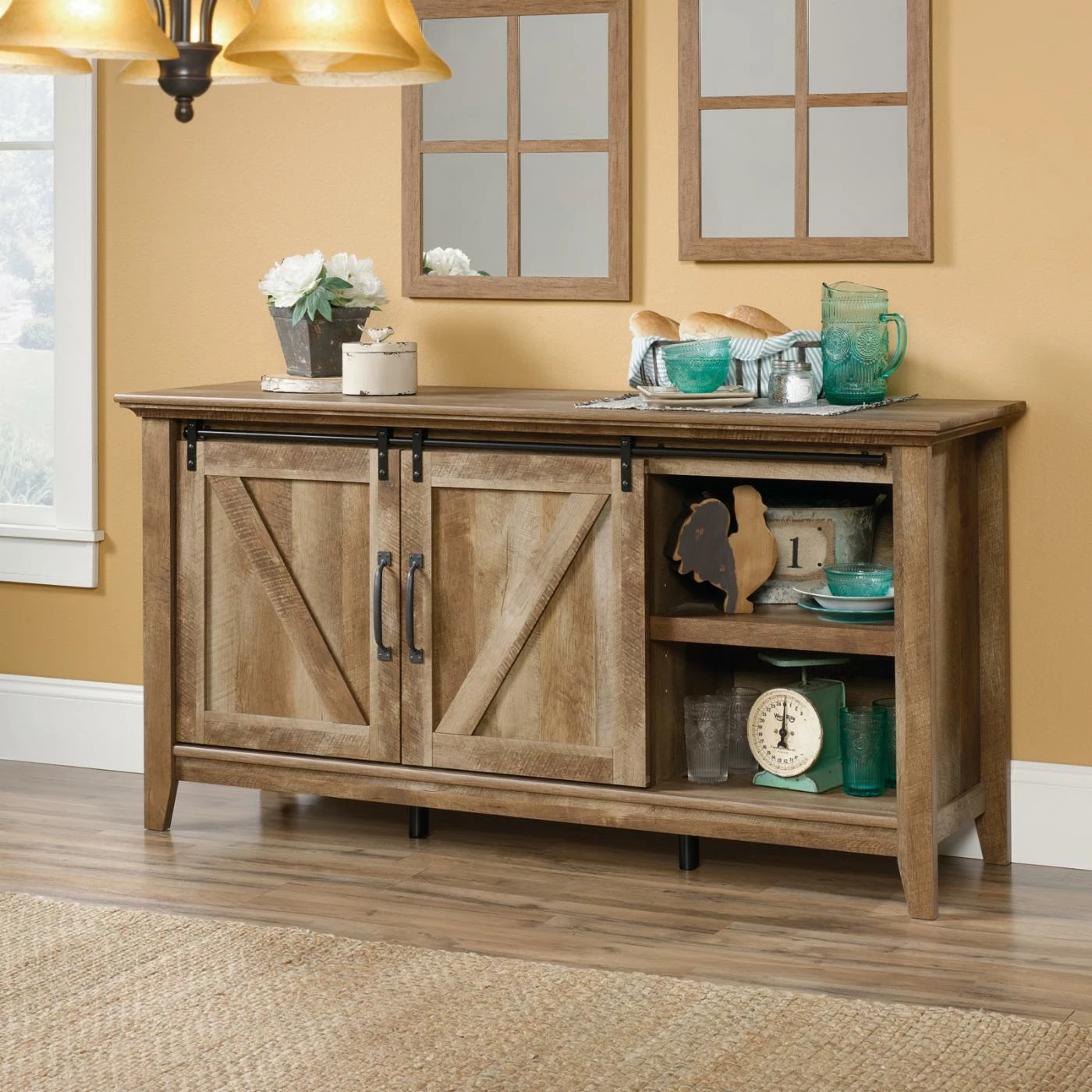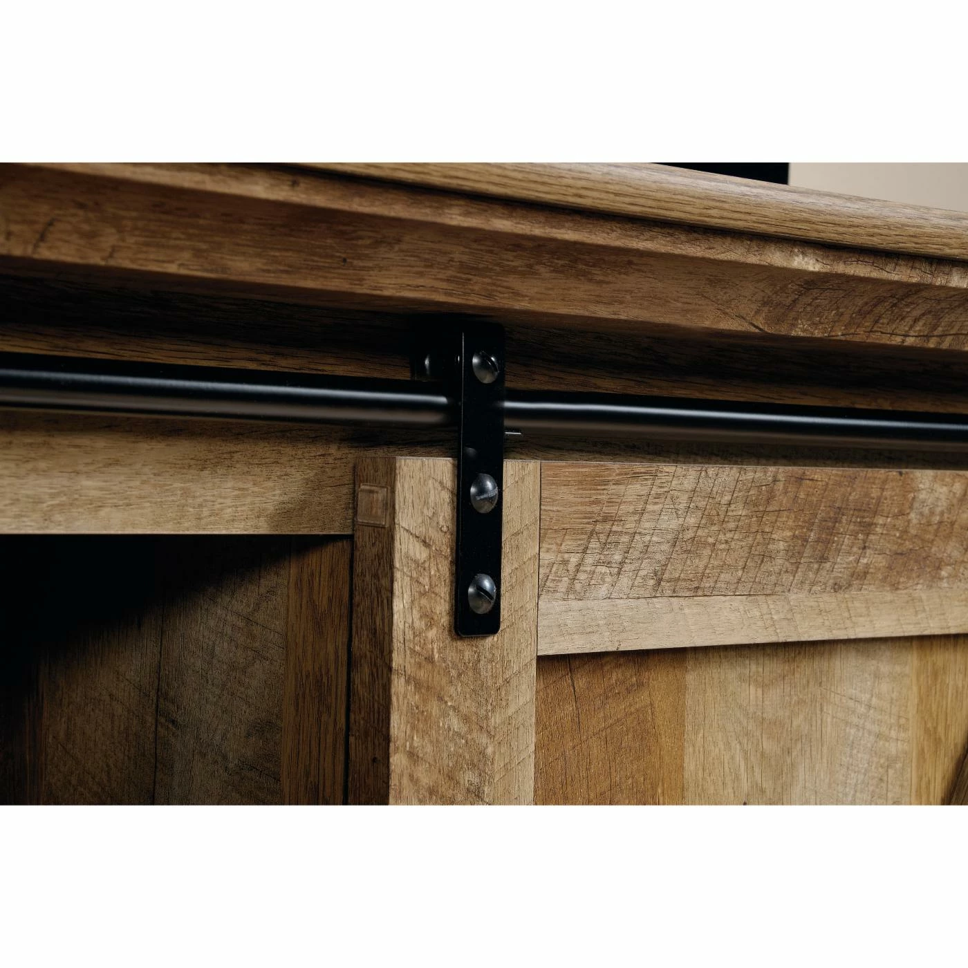 Add a touch of farmhouse charm and convenient storage to any room in your house with the Sauder Dakota Pass 65 in. Media Credenza. This handsome credenza is constructed from engineered wood and comes in a rustic craftsman oak finish that complements any style dรฉcor. It features two barn-style sliding doors that allow for a variety of configurations, and behind the doors are three adjustable shelves, providing plenty of storage space for electronics, accessories, games, linens, and more. The spacious surface of this wide credenza can hold televisions of up to 70 inches, and has an enclosed back panel with cord access to help keep electronics organized and your space looking clutter-free.