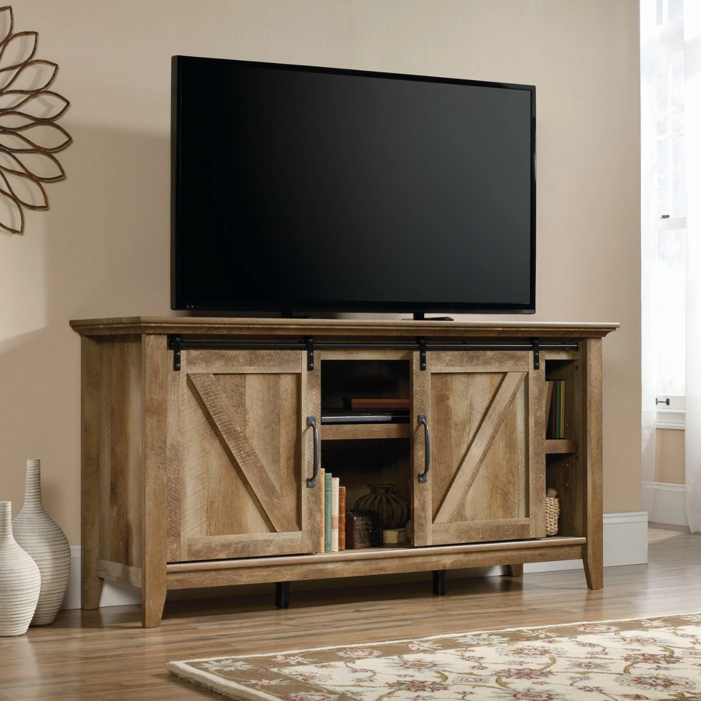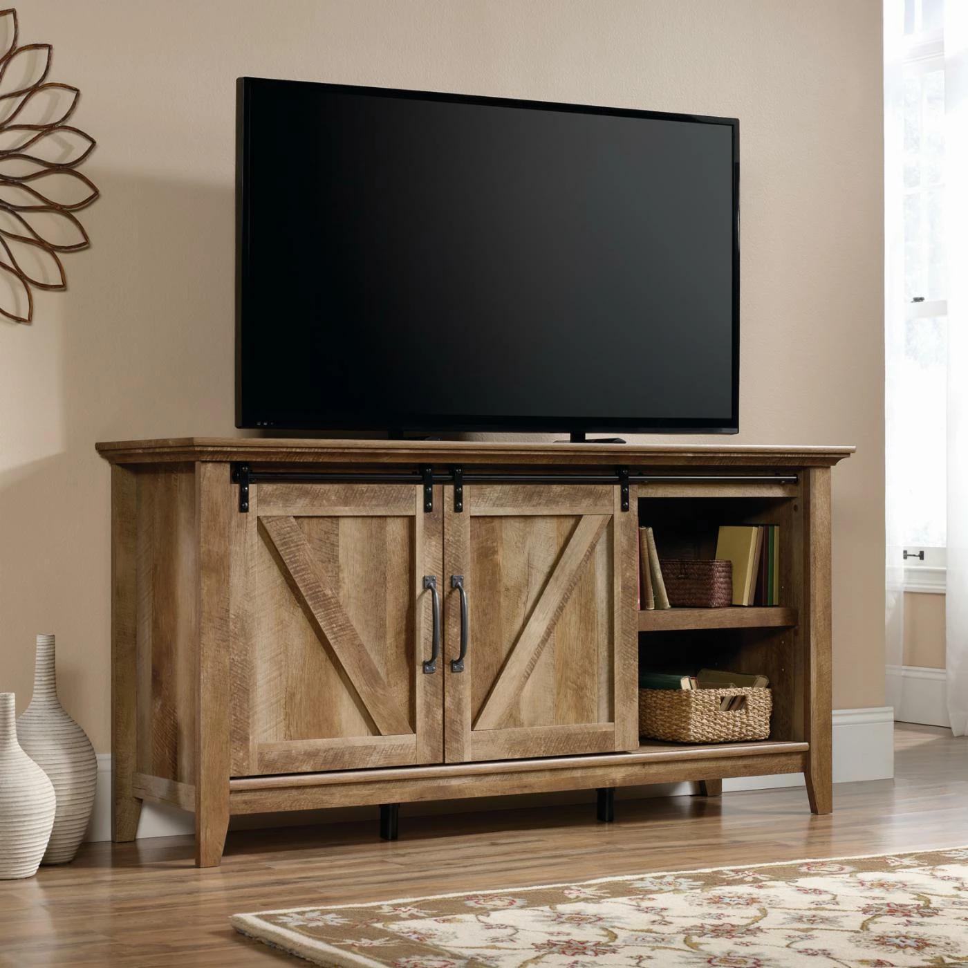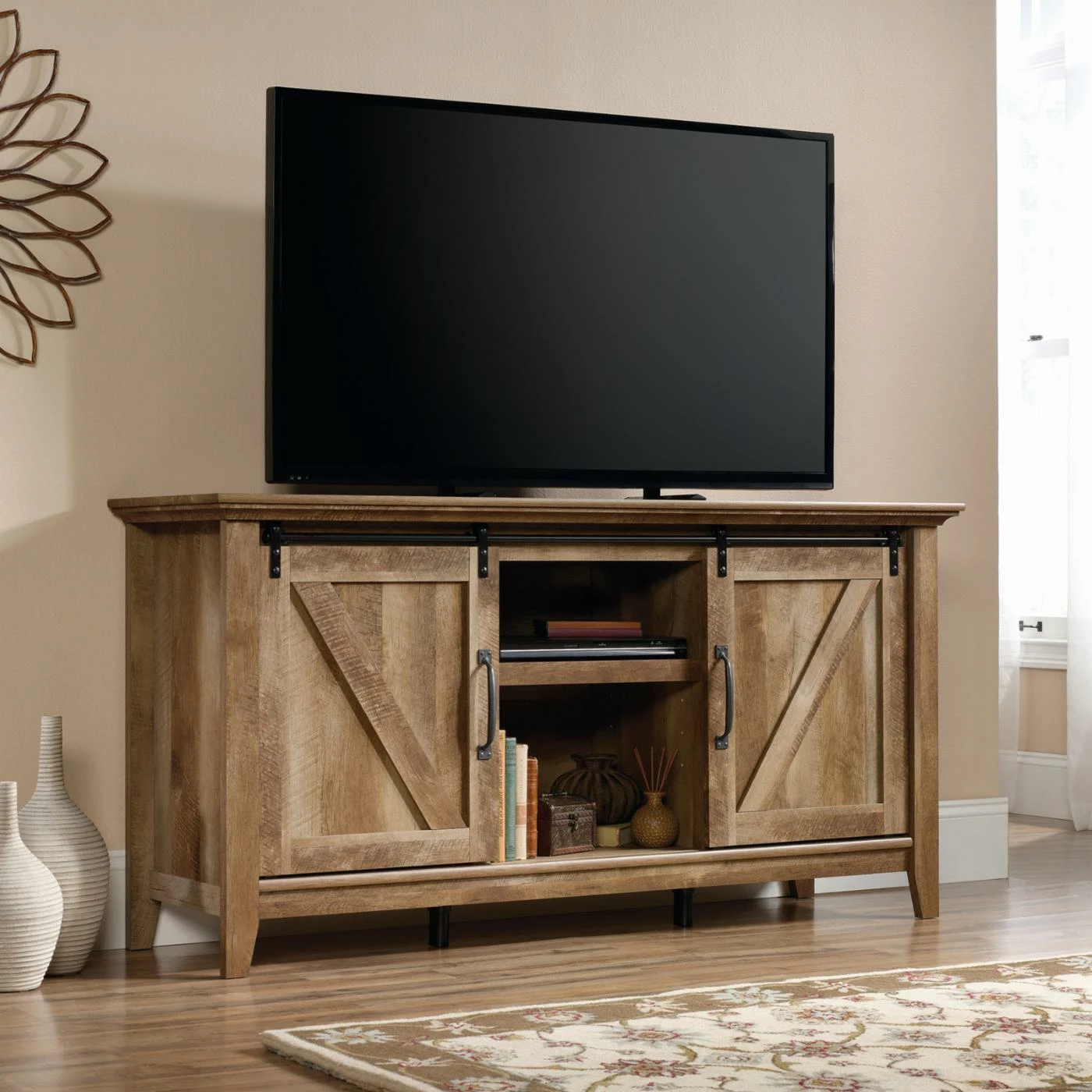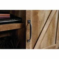 Add a touch of farmhouse charm and convenient storage to any room in your house with the Sauder Dakota Pass 65 in. Media Credenza. This handsome credenza is constructed from engineered wood and comes in a rustic craftsman oak finish that complements any style dรฉcor. It features two barn-style sliding doors that allow for a variety of configurations, and behind the doors are three adjustable shelves, providing plenty of storage space for electronics, accessories, games, linens, and more. The spacious surface of this wide credenza can hold televisions of up to 70 inches, and has an enclosed back panel with cord access to help keep electronics organized and your space looking clutter-free.