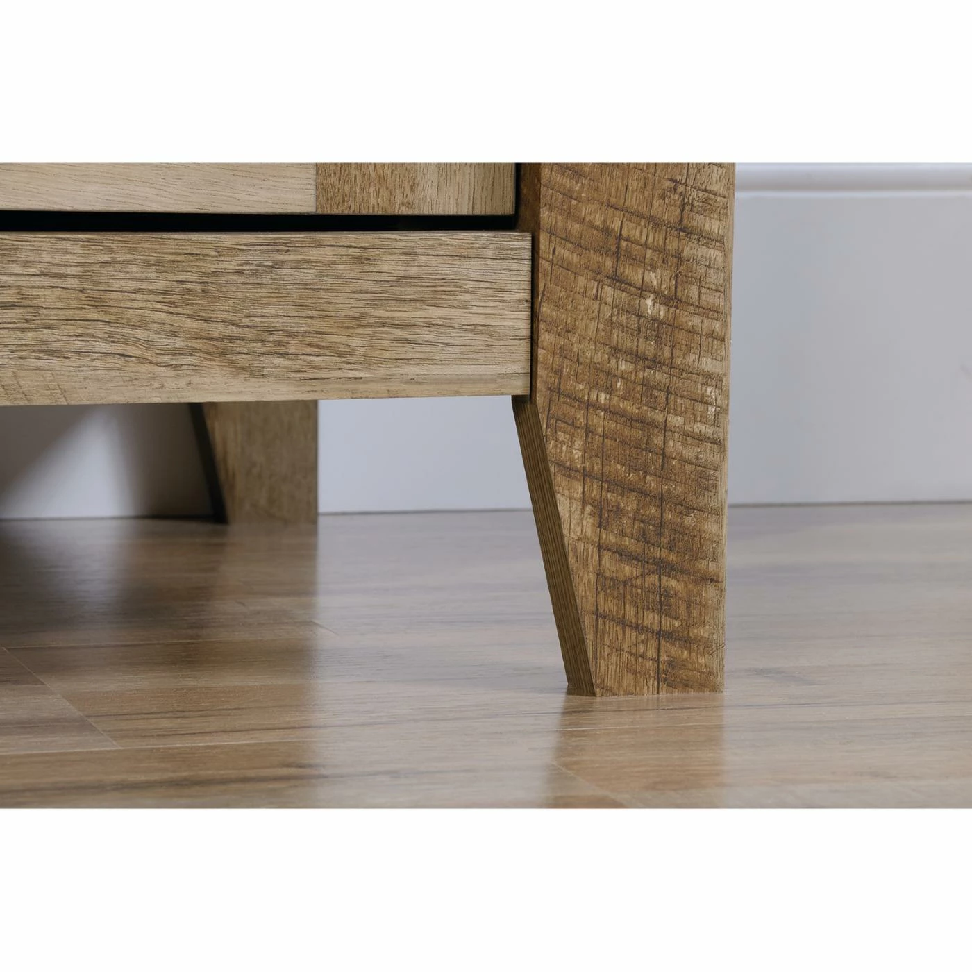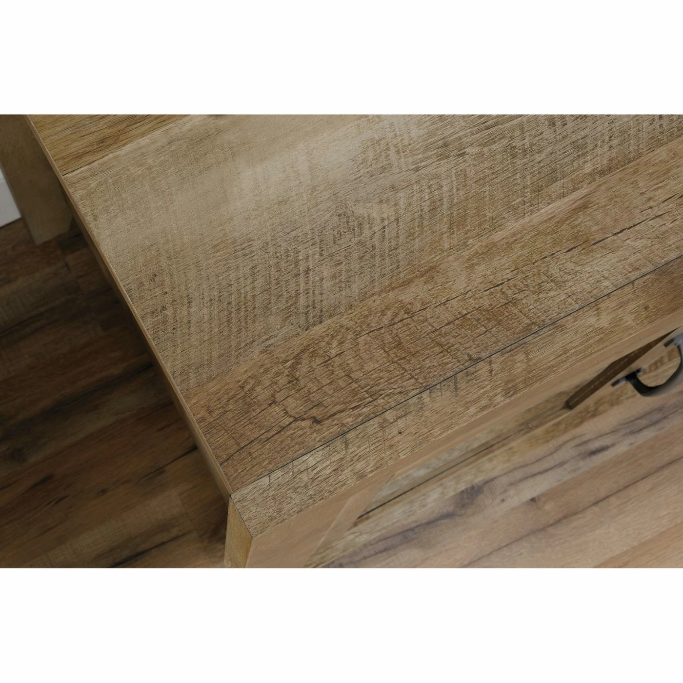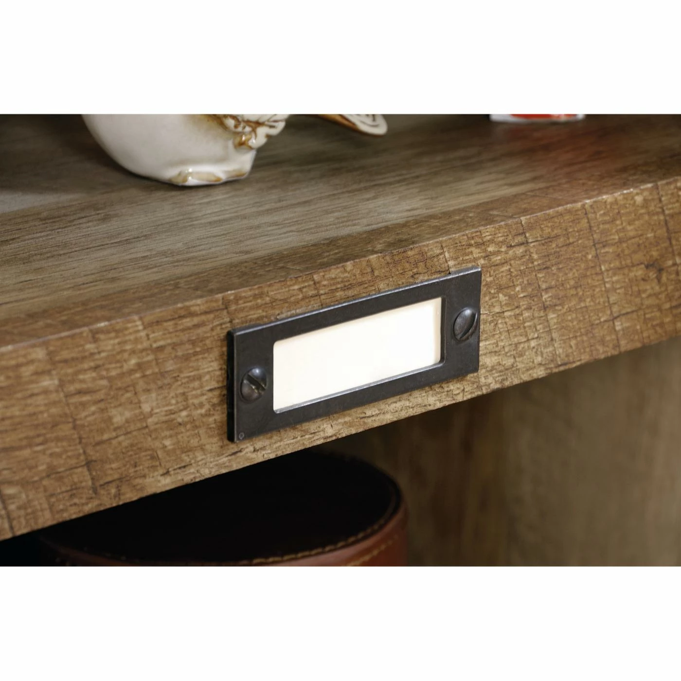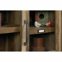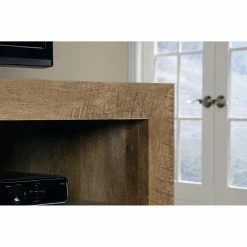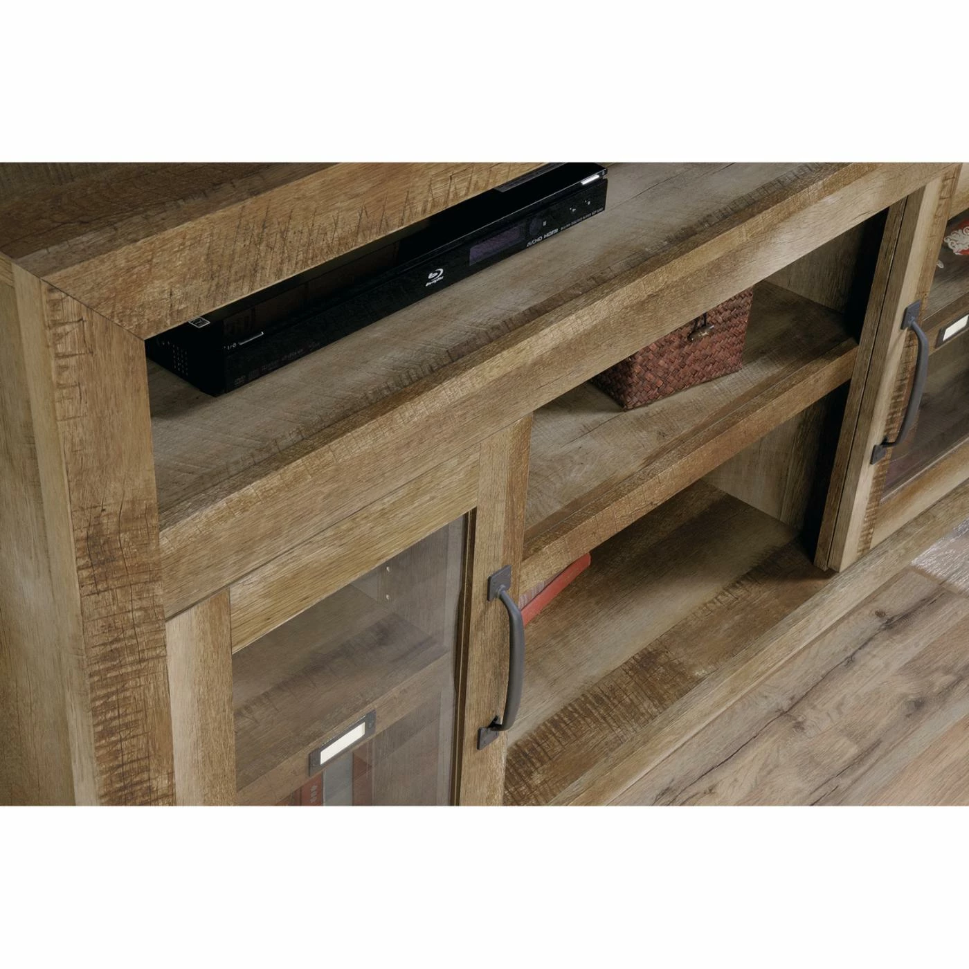 The sturdy and classic look of the Sauder Dakota Pass Collection Entertainment Center – Craftsman Oak Finish is only matched by it’s storage space. With solid looking craftsman-style oak laminate, this media console features adjustable shelves, beveled glass door cabinets, and removable center shelves to accommodate an optional electric fireplace. The enclosed back has predrilled holes for cord management, so your entertainment center doesn’t become a swarm of power cords. Style and storage come together with this beautiful media console.