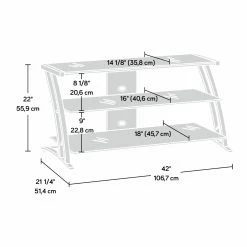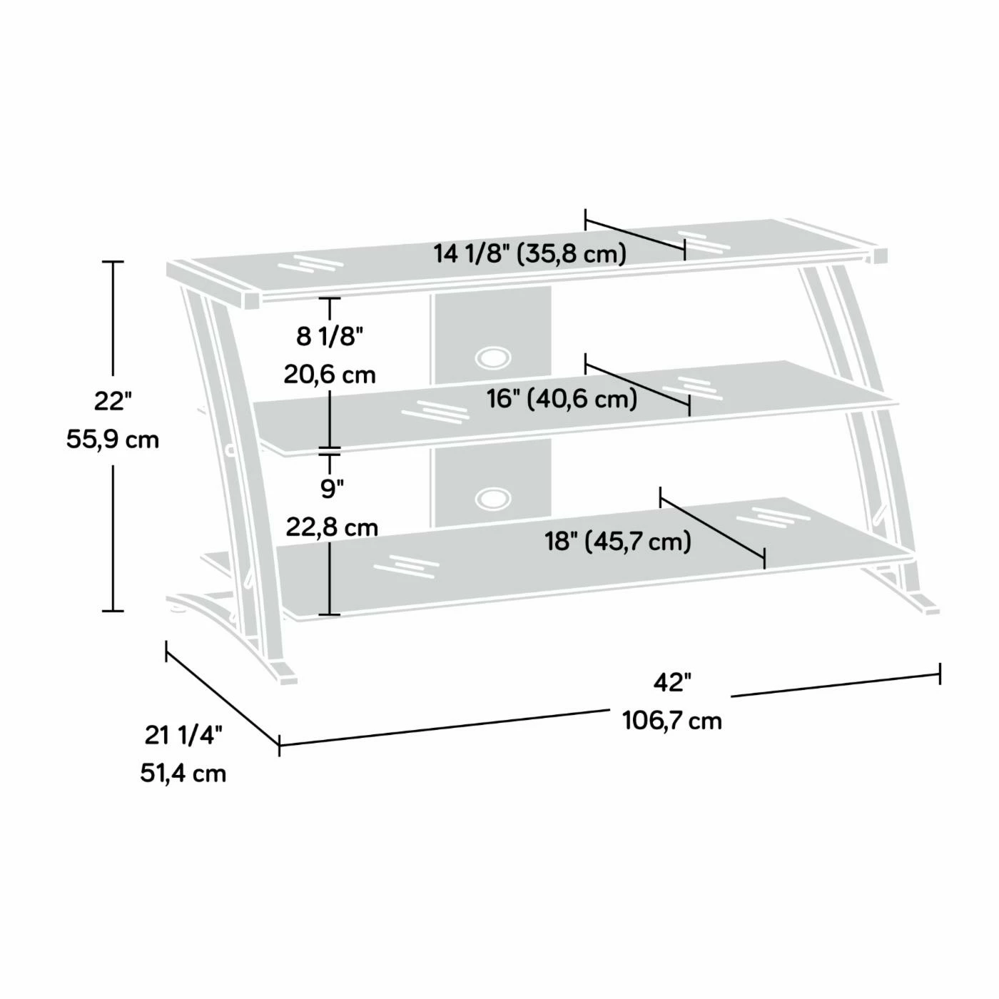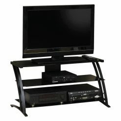 The sleek, minimal shape of the Sauder Deco Panel TV Stand – Black is going to give you the perfect way to display and use your entertainment system. This TV stand features a wide top that’s got plenty of space for flat-panel TVs measuring up to 45 inches. Down below you have two open shelves that give you room for your cable boxes, gaming consoles, and all the pieces that make your TV go. This stand is constructed from rigid metal with tempered glass shelves. It stands on adjustable levelers for a more stable footing on any surface.