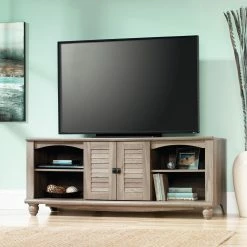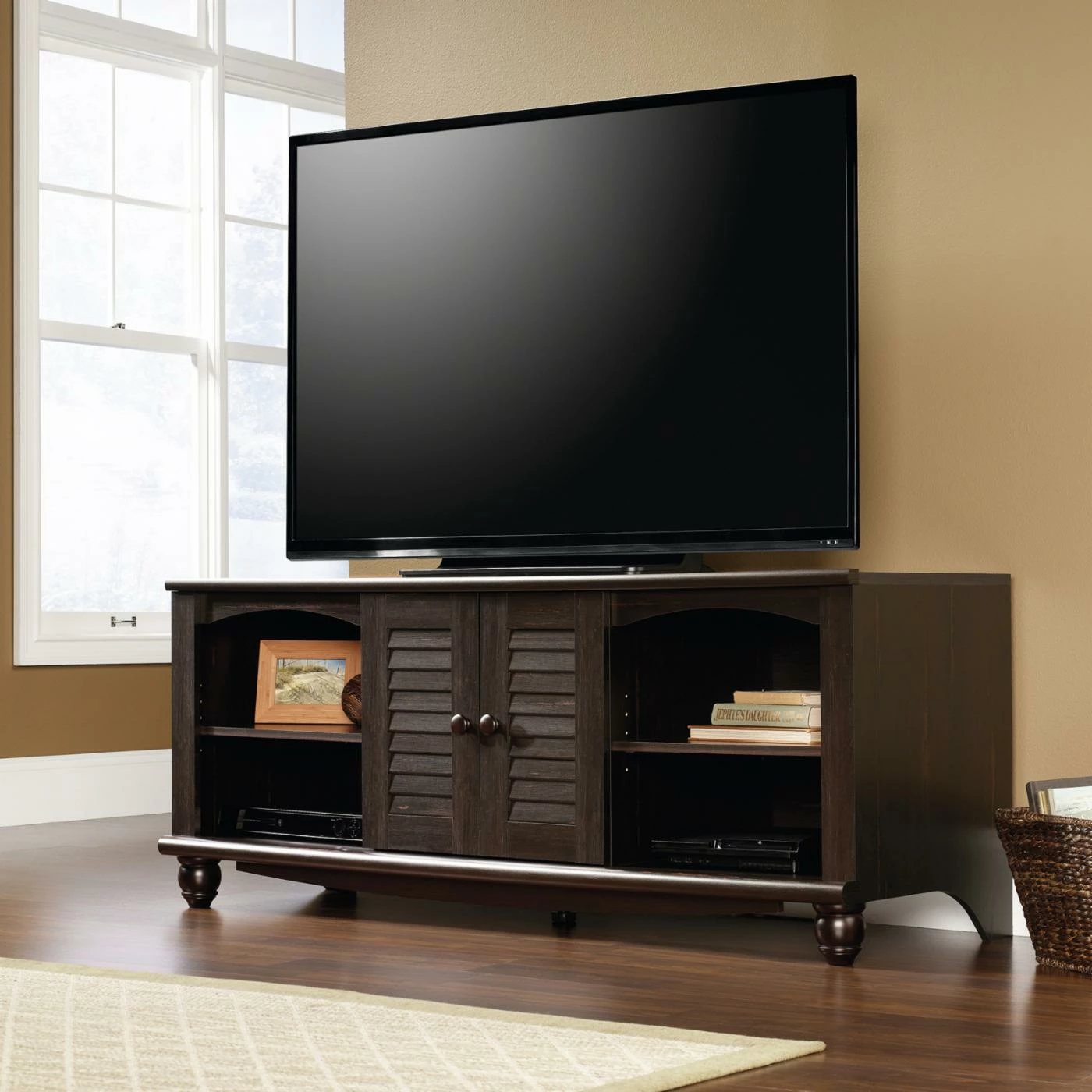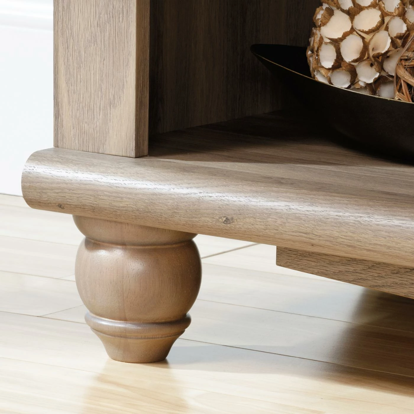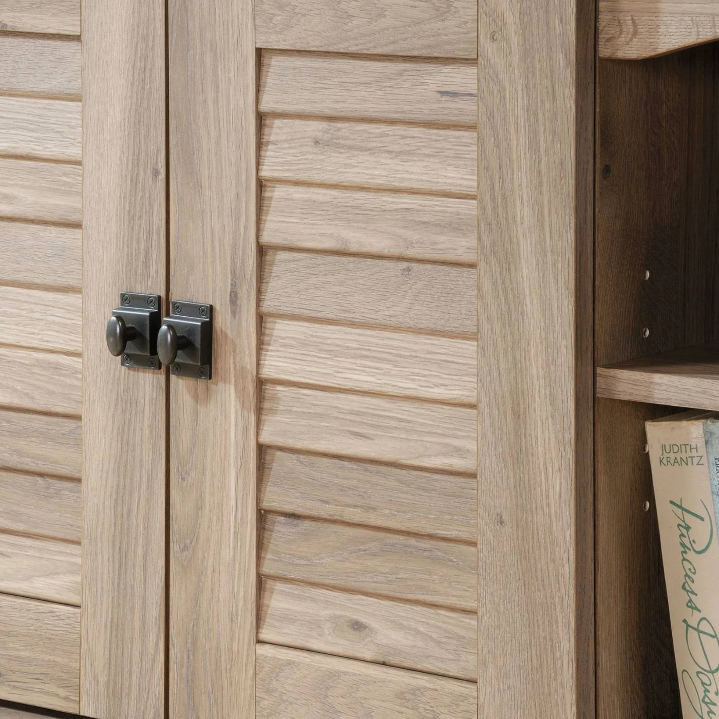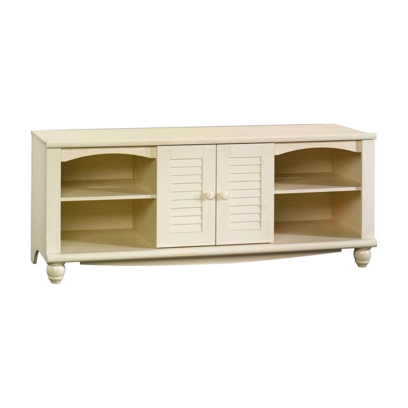 Bring a little coastal elegance into your décor with the Sauder Harbor View Entertainment Credenza. This credenza features two doors and open shelves for ample storage space. This piece boasts louvered doors and your choice of available finishes.