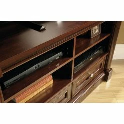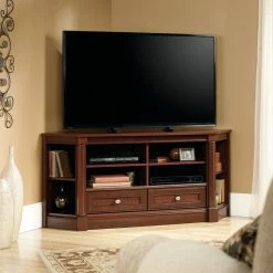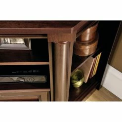Save some space while you enjoy watching your favorite shows with the Sauder Palladia Corner Entertainment Credenza. This corner-hugging piece is made with engineered wood. It includes two adjustable shelves in the center and two adjustable corner display shelves. The two bottom drawers have metal runners and safety stops.