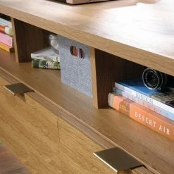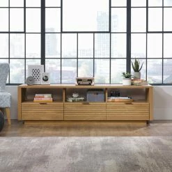 Modern edges gets softer with the Sauder Soft Modern Entertainment Credenza‘s light, natural finish. Crafted with engineered wood and strengthening wood laminate, this clean-lined media credenza is finished in select colors. Three paneled drawers open on metal runners, and internal safety stops feature a patented T-lock assembly system. Above the drawers, three open shelves are ideal for media components or as display space. Sleek silver hardware is the final contemporary touch. Supports TVs up to 80W inches and weighing 135 pounds or fewer.
