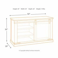 The Signature Design by Ashley Budmore 50 in. TV Stand – Rustic Brown offers country charm with a modern edge. The feature of this TV stand is the barn door that slides easily from one side of this stand to the other, giving you access to the four adjustable shelves. The warm, dark brown finish on the veneer, wood, and engineered wood construction complements the black hardware. The generously sized tabletop can accommodate televisions up to 50 inches wide.