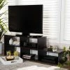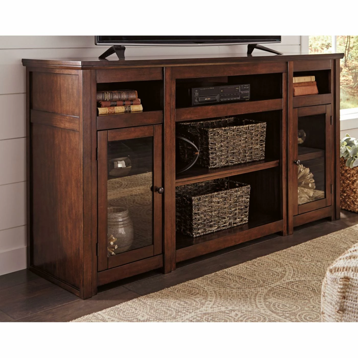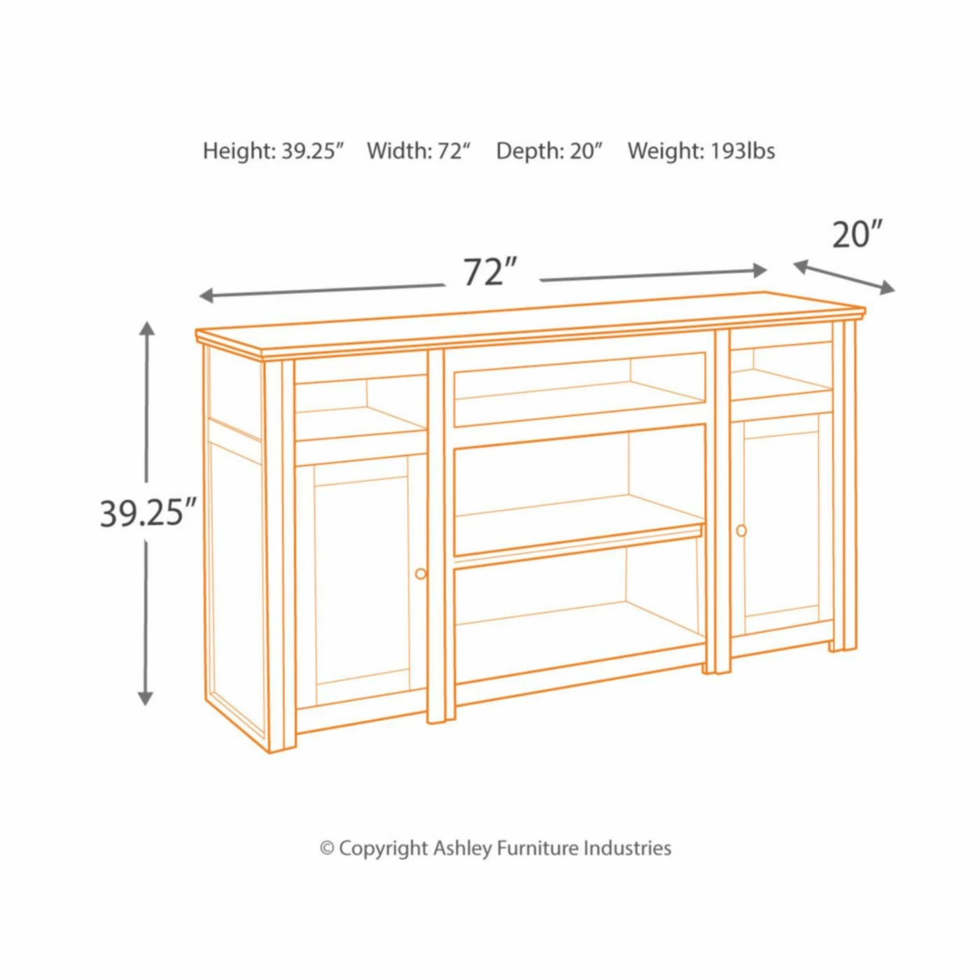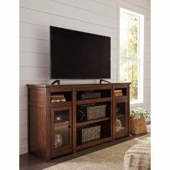 The strong, classic lines of the Signature Design by Ashley Harpan TV Stand – Reddish Brown is at home in a farmhouse, transitional, or traditional space. Rich mango veneers glow with a dark brown hue on the wood and engineered wood construction. Wide enough to hold most televisions up to 65 inches, this stunning piece boasts cutouts at the back for ventilation and wire management. Two glass-front cabinets open to reveal and adjustable shelf in each, and sit below three open media cubbies. A center shelf can be adjusted or removed entirely to fit a fireplace insert (not included) to increase the ambiance of your home entertainment center.