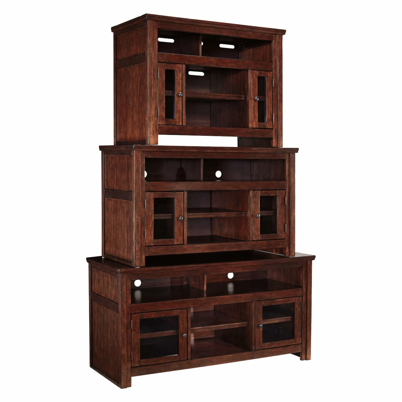 This versatile Signature Design by Ashley Harpan TV Stand features classic mission lines and a rich cherry finish that works with a variety of interiors. Smart media storage includes open media component shelving plus abundant cord management and ventilation holes at the back. Wood framed glass cupboard doors and adjustable shelving give this TV stand customized storage. Choose from available sizes.