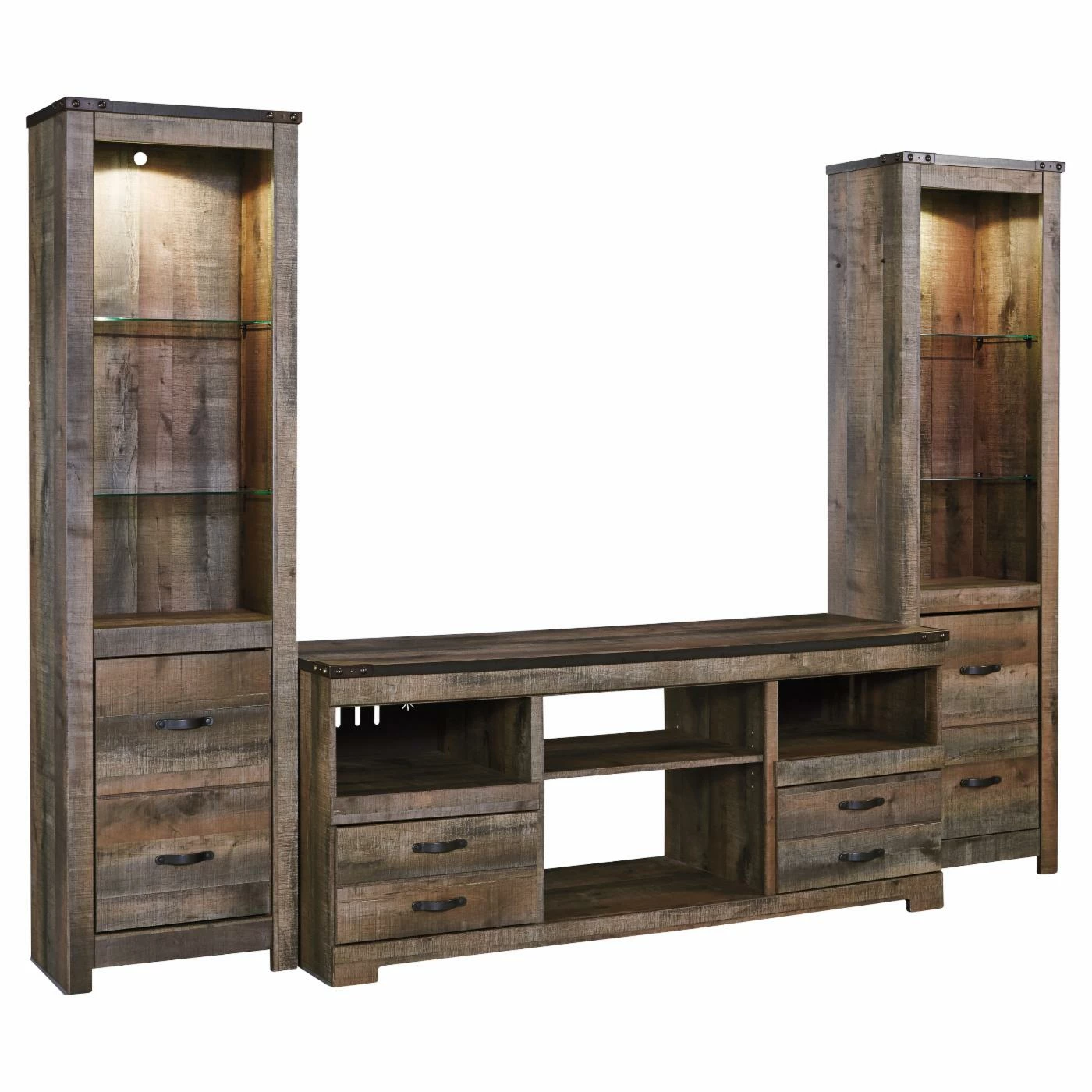 Embrace technology without losing site of nature with the Signature Design by Ashley Trinell 63 in. TV Stand. The gray-washed, oak-grain finish, reclaimed-feeling bronze-finished hardware, and nailhead detailing gives this stand a rustic, earthy allure. An adjustable center shelf, gliding drawers and open storage cubbies allow for the concealed storage of media or the display of favorite knicknacks. A found wood texture makes this table a standout addition to any home or office. The center shelf can be removed to install a fireplace insert.
