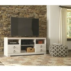 The Signature Design by Ashley Willowton TV Stand – Whitewash invites a coastal ambiance into your home with high style. This charming stand boasts sturdy veneer and engineered wood construction with a whitewash finish reminiscent of driftwood. Nickel tone drawer pulls add a touch of elegance to the two smooth gliding drawers. Two media cubbies and a center storage space offer the perfect place to store your components or other media, and offer cutouts for wire management. The center shelf can be removed to provide a larger storage space or to include a fireplace insert (sold separately). This shabby-chic design can hold televisions up to 63 inches wide.