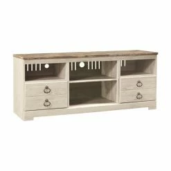 The Signature Design by Ashley Willowton TV Stand – Whitewash invites a coastal ambiance into your home with high style. This charming stand boasts sturdy veneer and engineered wood construction with a whitewash finish reminiscent of driftwood. Nickel tone drawer pulls add a touch of elegance to the two smooth gliding drawers. Two media cubbies and a center storage space offer the perfect place to store your components or other media, and offer cutouts for wire management. The center shelf can be removed to provide a larger storage space or to include a fireplace insert (sold separately). This shabby-chic design can hold televisions up to 63 inches wide.