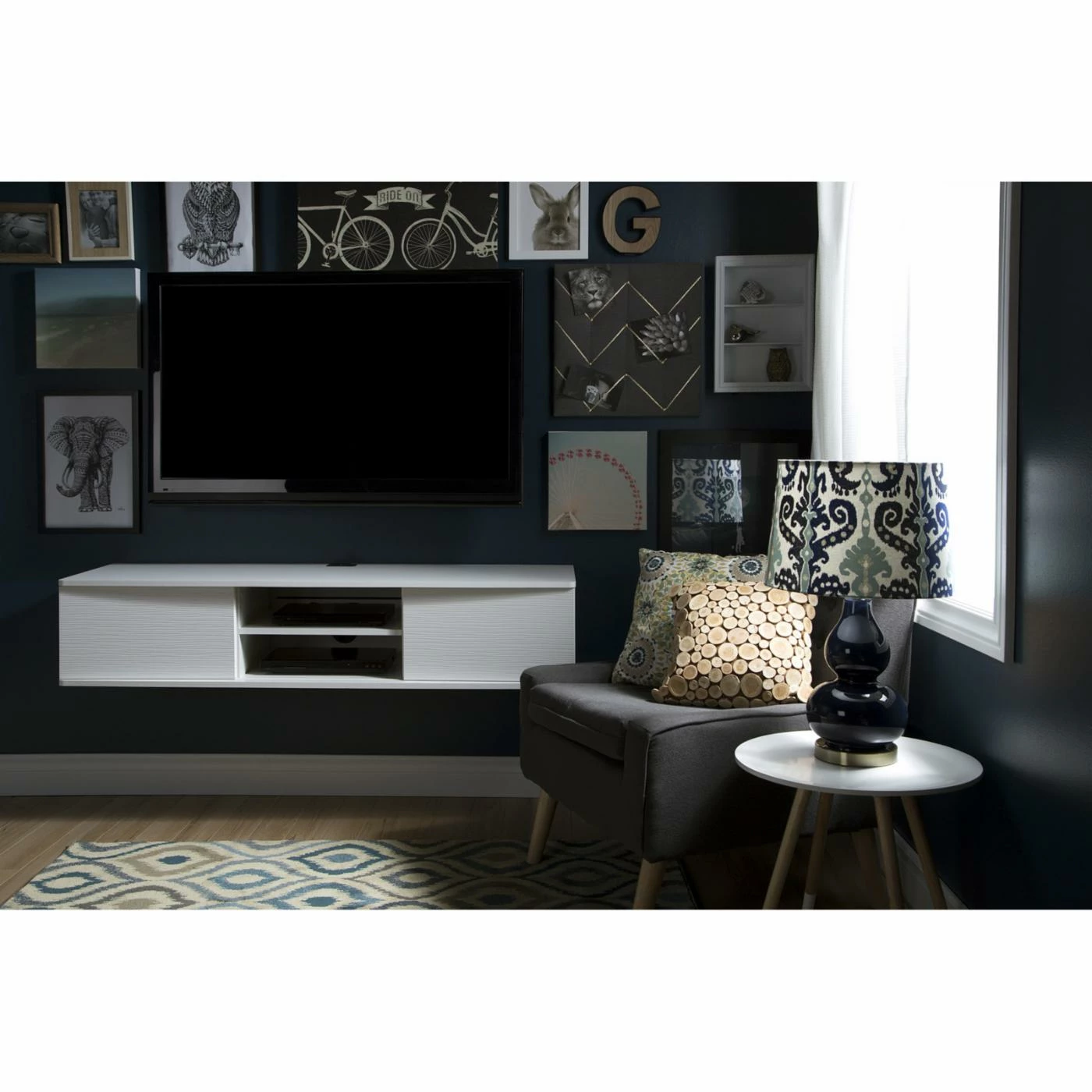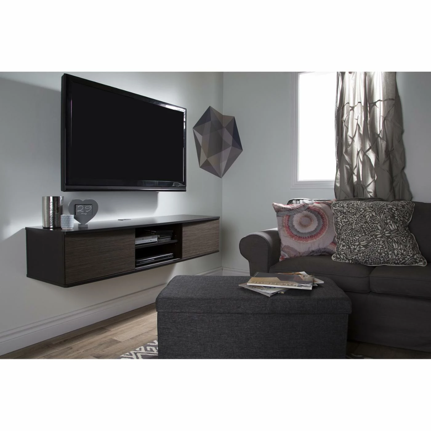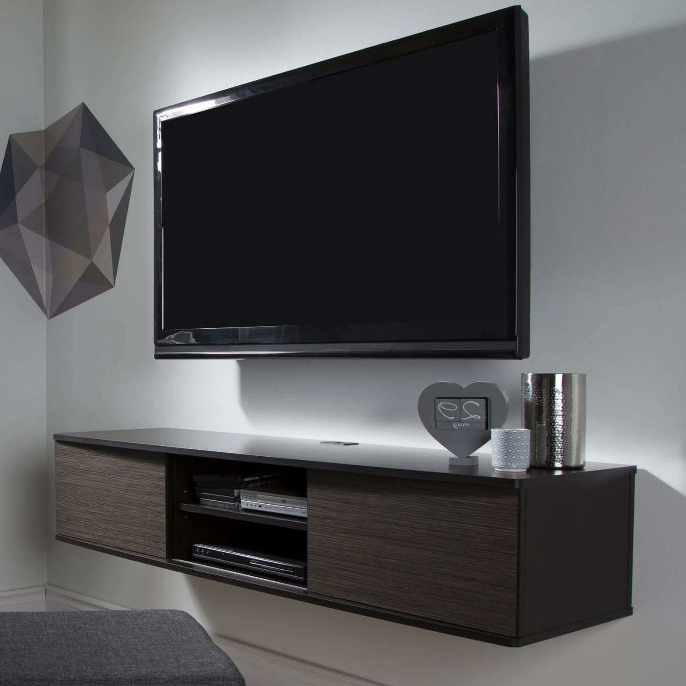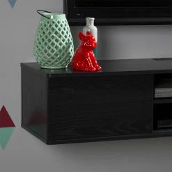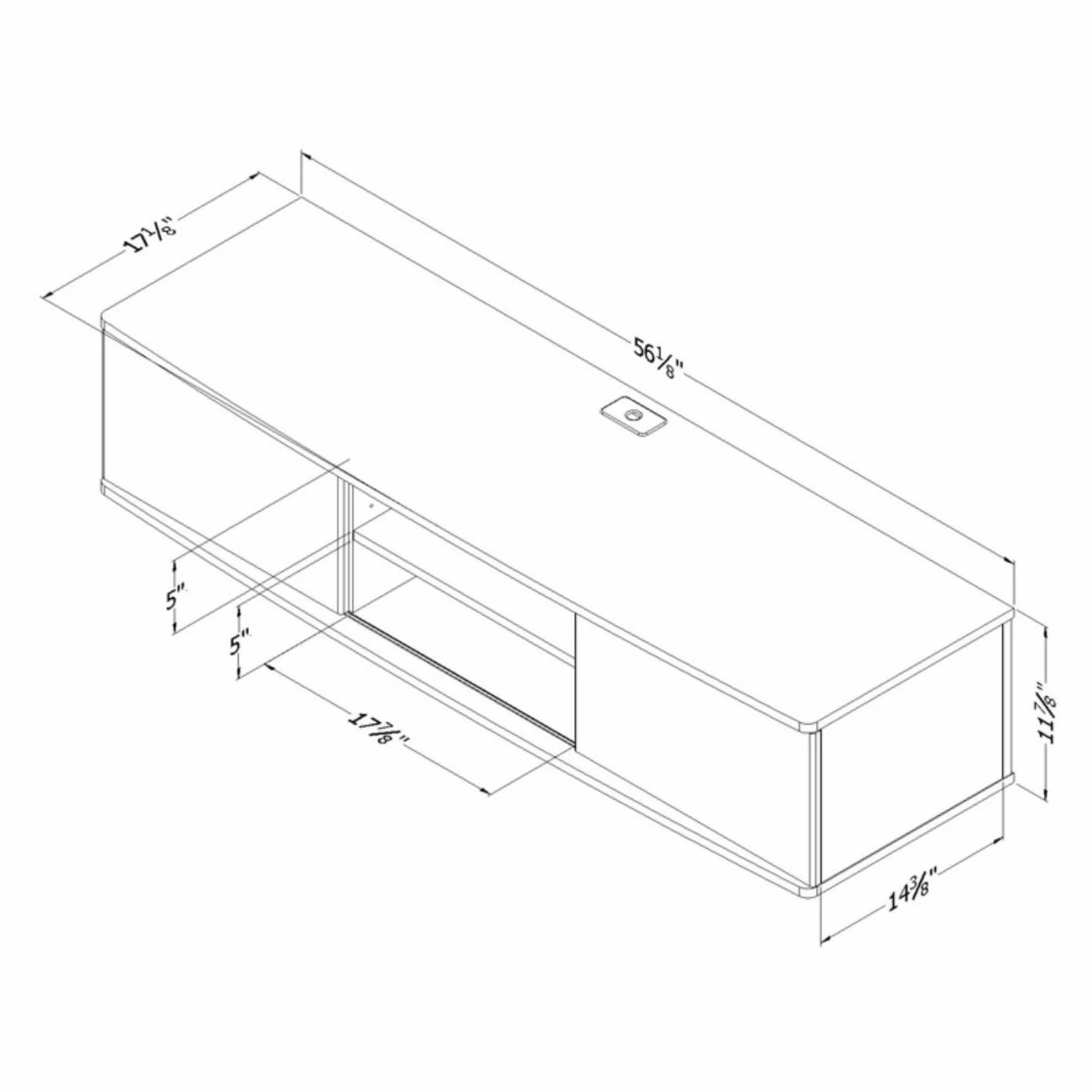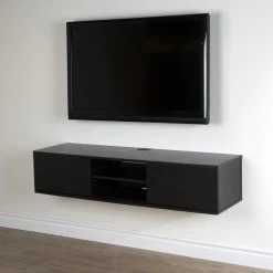 Add style and storage space to your home with the South Shore Agora 57 in. Wall Mounted Media Console. Designed to be mounted on the wall, this media console can hold up to 165 pounds and features six storage spaces separated by two adjustable shelves and sliding doors which allow you to choose the configuration of your open and hidden storage spaces. Crafted from non-toxic laminate particleboard and available in your choice of finish, you’ll have no trouble matching with your existing decor. The open hole in the back gives you easy wire management while the rounded corners provide added safety. This set includes the metal handing system for mounting the TV stand while the fastening device for hanging your TV is sold separately.