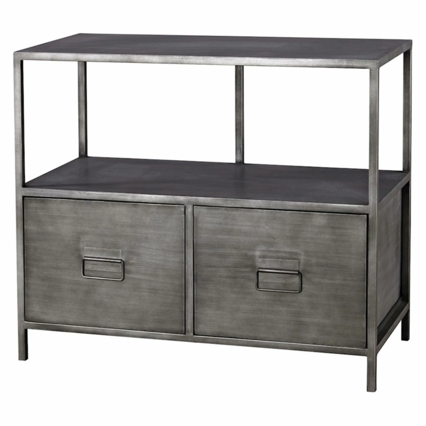 Designed to seem as if it were rescued from the office of some turn-of-the-century factory, the Sterling Gunther TV Stand adds vintage industrial appeal to viewing areas. The graphite-finished television stand is fabricated out of durable metal to provide plenty of sturdy support for your TV. AV components can be stored on the open shelf below, and two deep drawers provide a place for stowing media and remote controls. An open back eliminates worries about cable management.