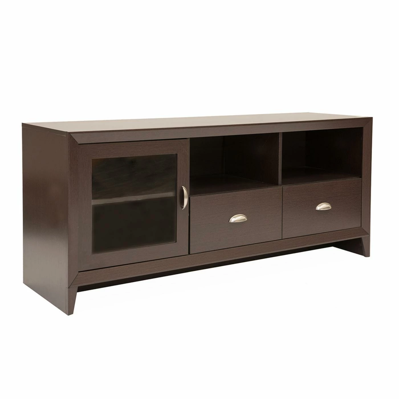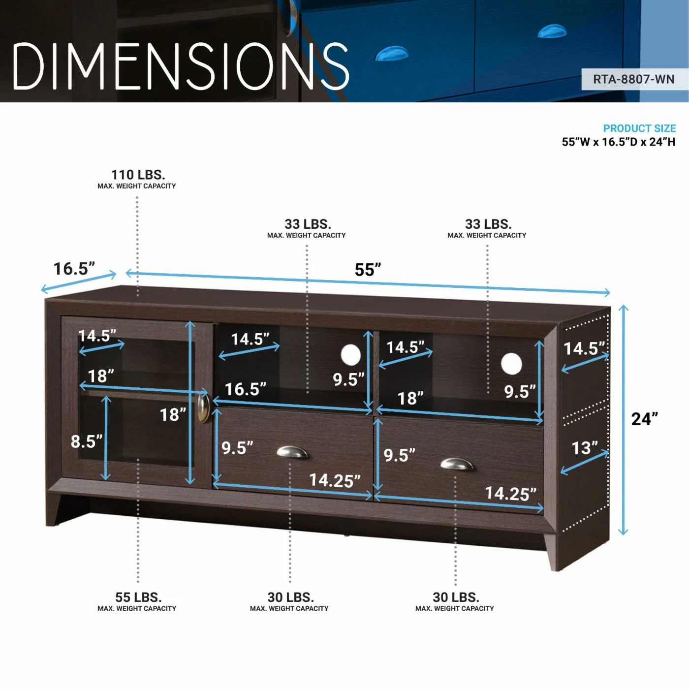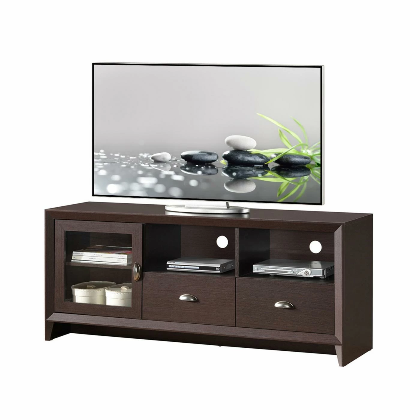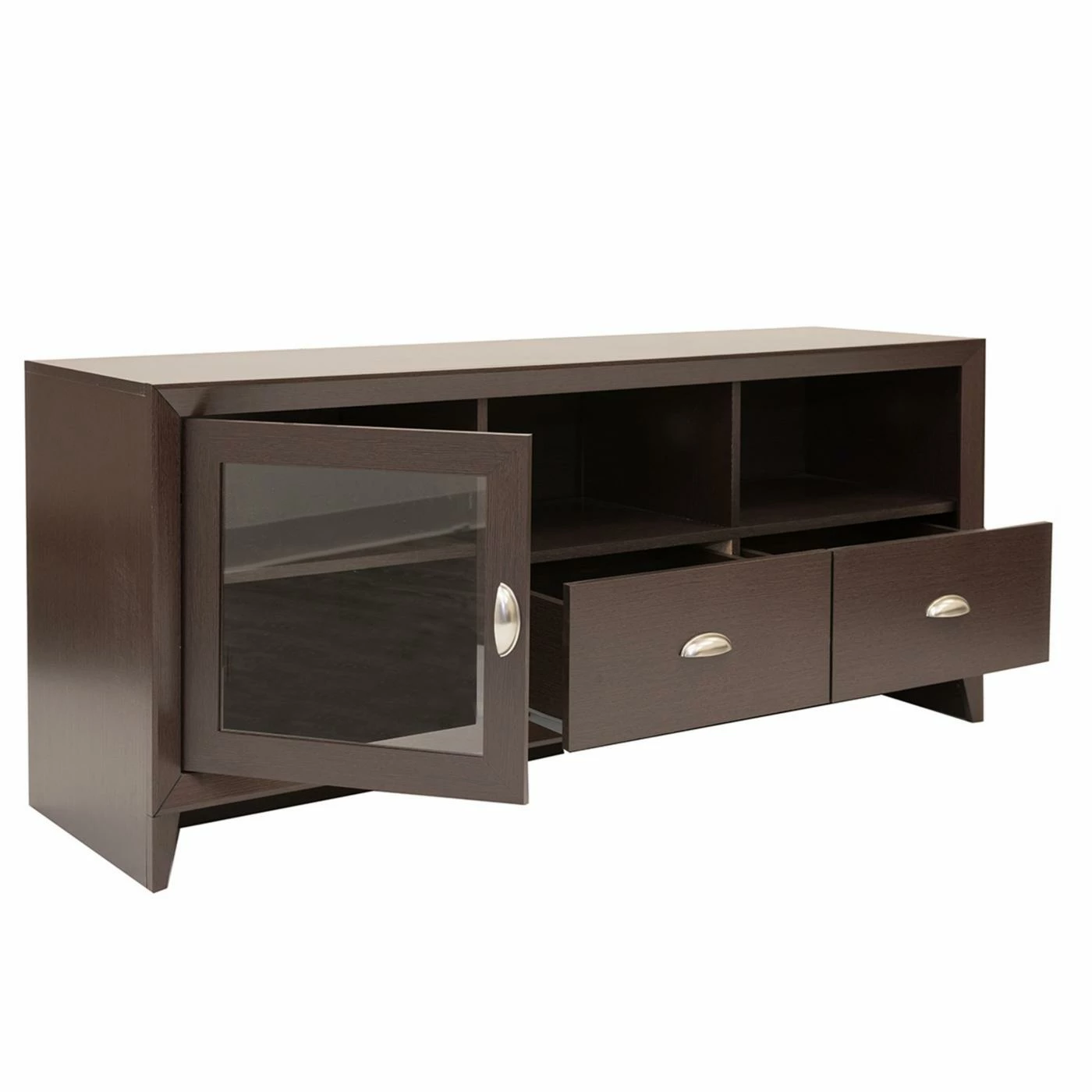Maximize your space while you relax with the Techni Mobili Modern TV Stand with Storage – Wenge. This cabinet features a sturdy top to hold your television, with two open shelves, two drawers, and a glass door storage cabinet for easy and convenient organization. The compressed wood frame features a laminated finish for scratch-resistant appeal.