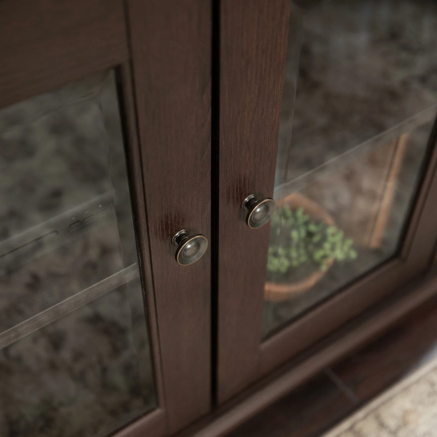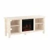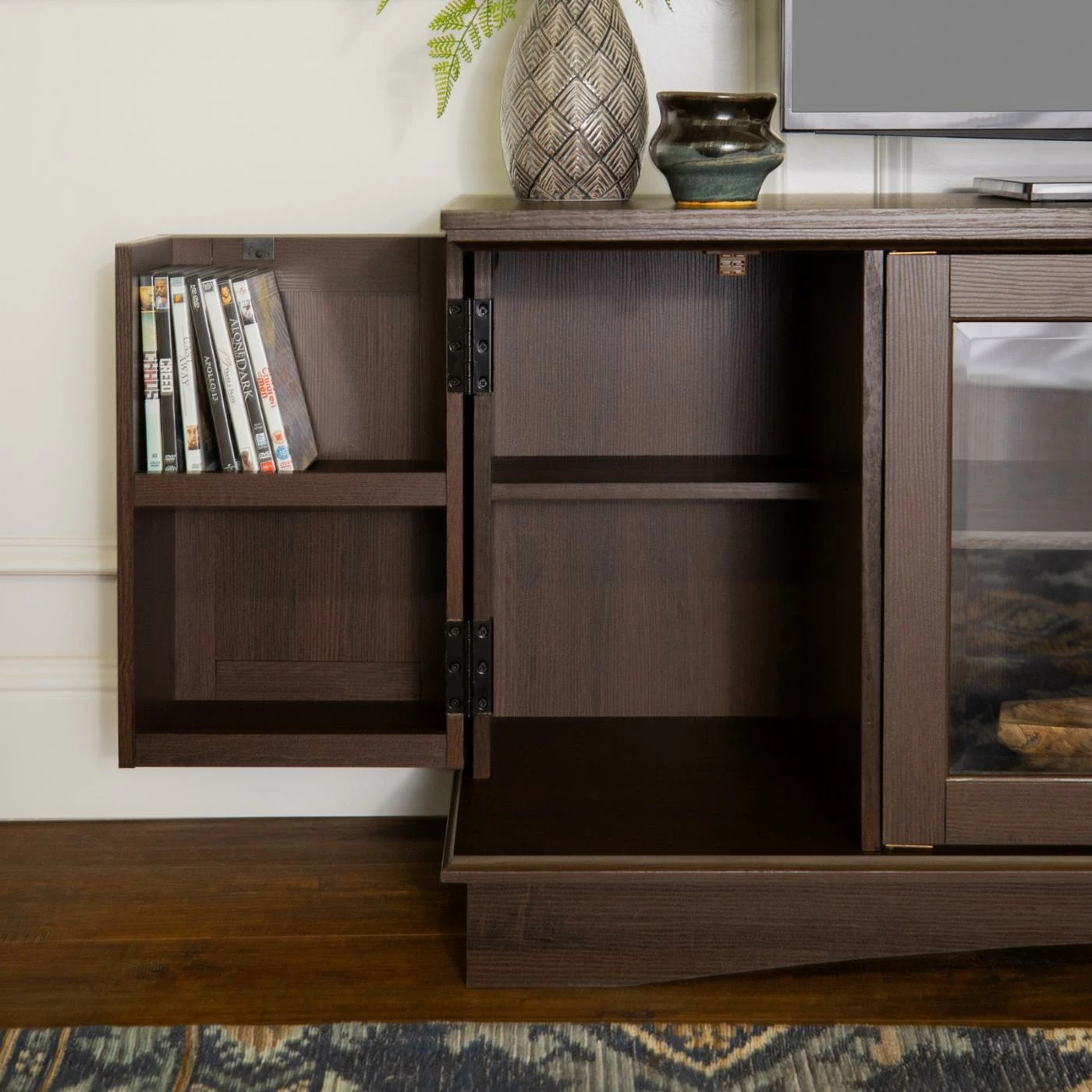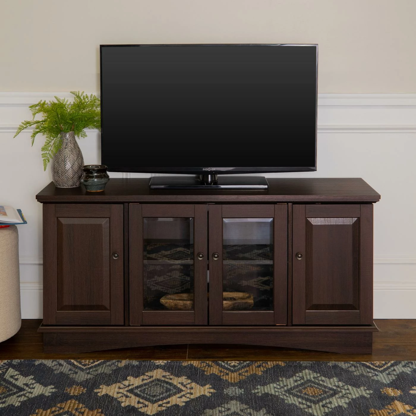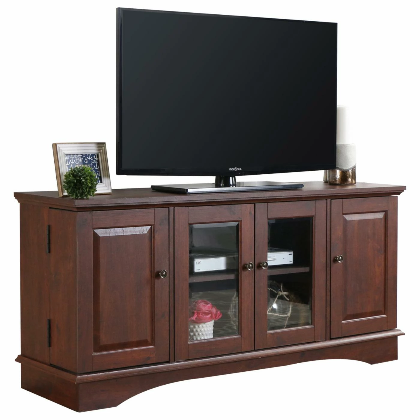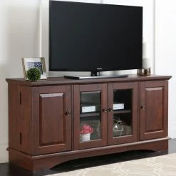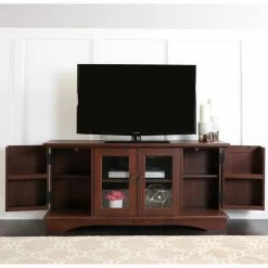 We know how messy TV rooms can get with all those discs, cords, and remotes. That’s why we recommend the Walker Edison 52-in. Media Storage Wood TV Console – Traditional Brown. Durably constructed with laminate and MDF (a dense, warp-resistant engineered wood), this sturdy TV console offers multiple storage features to keep all your equipment organized. Two outer, wood-panel doors open and fold outward, revealing eight shelves specially designed for DVDs, Blu-ray discs, and CDs. The center cabinet houses two shelves behind two glass-paned doors that allow remote signals to pass through easily. Not too traditional but not too modern, this super-practical TV console boasts a warm brown finish and brass-finished knobs. The stand’s spacious top holds most flat panel TVs measuring up to 57 inches wide.