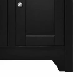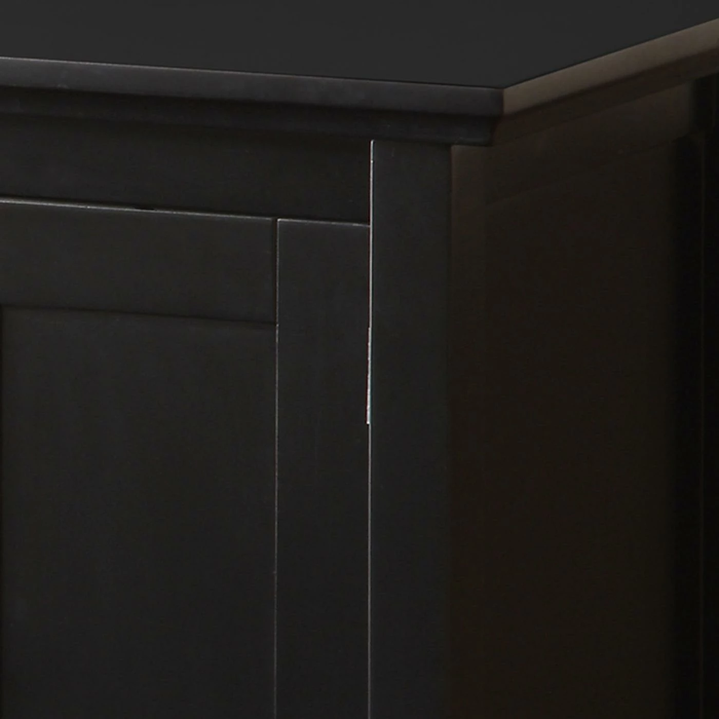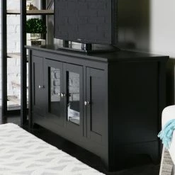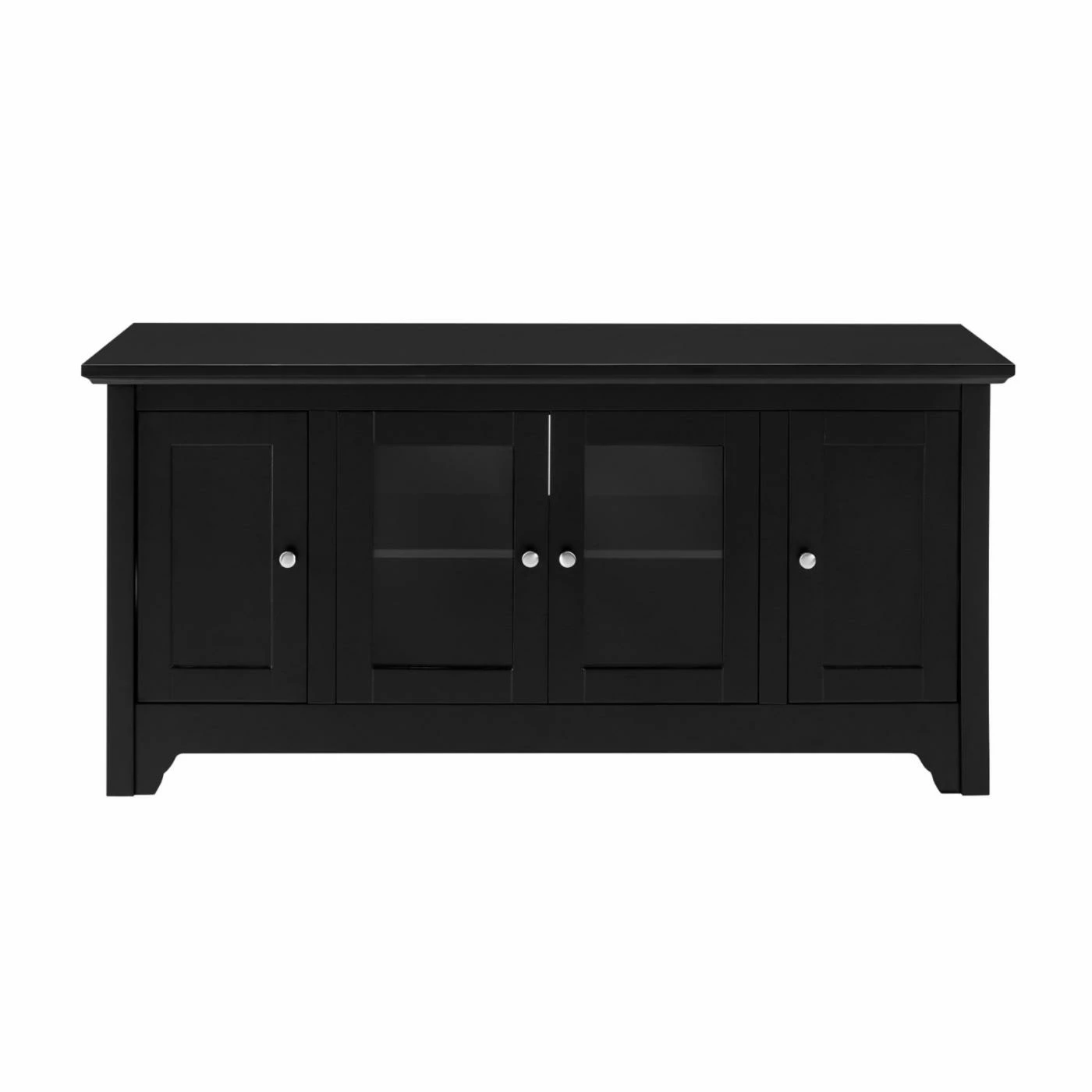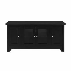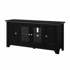 The Walker Edison 53-in. Wood TV Console with 4-Doors – Matte Black manages to deliver exceptional storage and confident style without overwhelming the room. Finished in a cool matte black, this modern TV stand is crafted with solid Asian hardwood and wood veneers. Silver-finished knobs add a bit of bling, while clean lines keep it simple. Designed to keep your TV room organized, the console provides shelving behind two glass-paned doors in the center and two wood-paneled doors on the sides. The sturdy top holds most TVs measuring up to 58 inches wide.