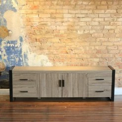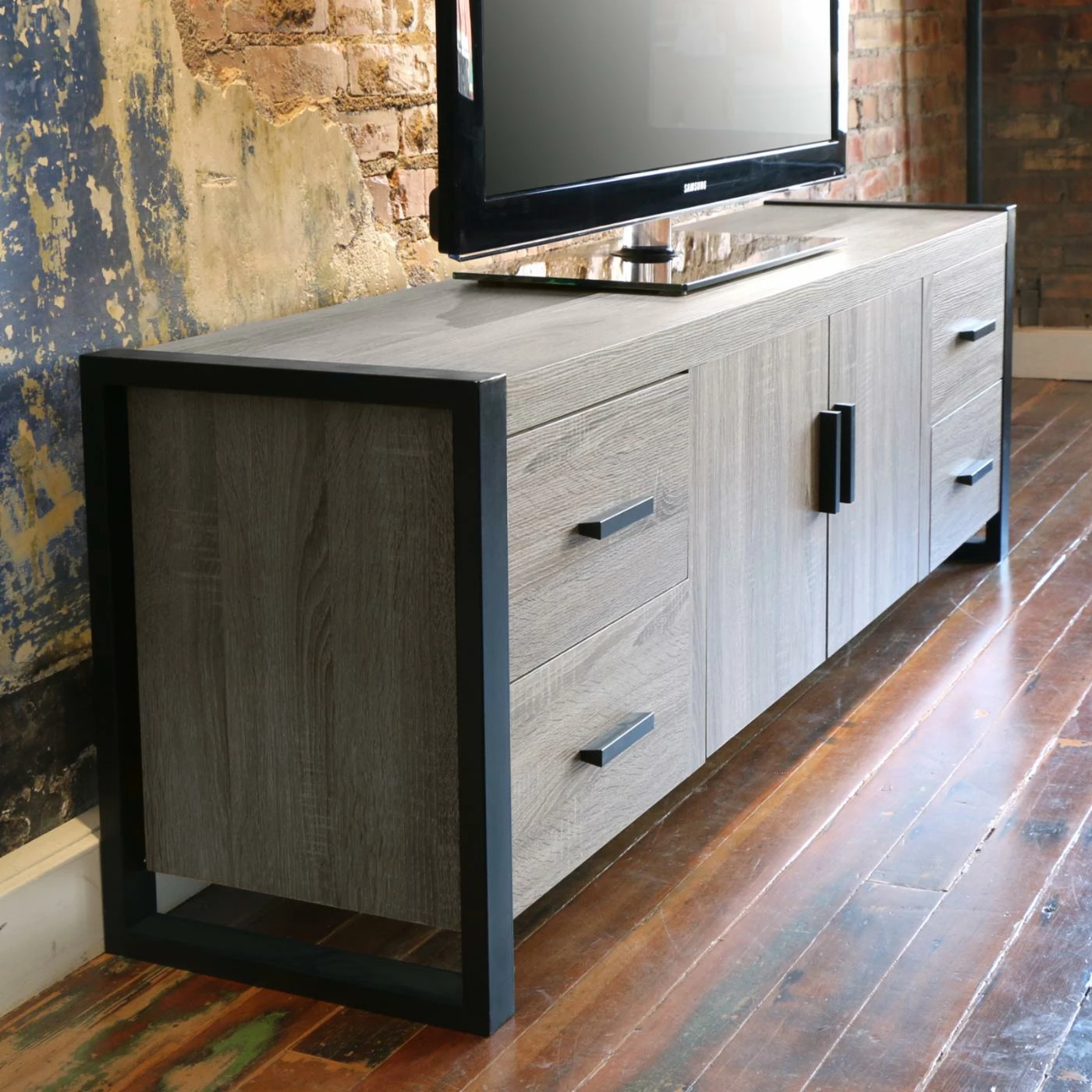 Add Euro-style to any entertainment space with the Walker Edison 70 in. Urban Wood TV Stand. This sleek stand offers a beautiful contrast with its dark powder coated steel frame. Its city-chic appeal provides clean looking storage options behind dual doors and ebony pulls. House all your entertainment accessories in the four smooth opening drawers. Keep components on its middle shelf while cable management holes relieve the headache of tangled cords. Need an excuse to get that 79-inch screen you’ve been eyeing? Well here it is.