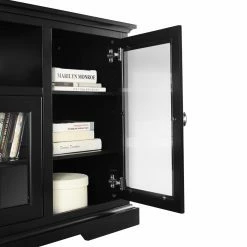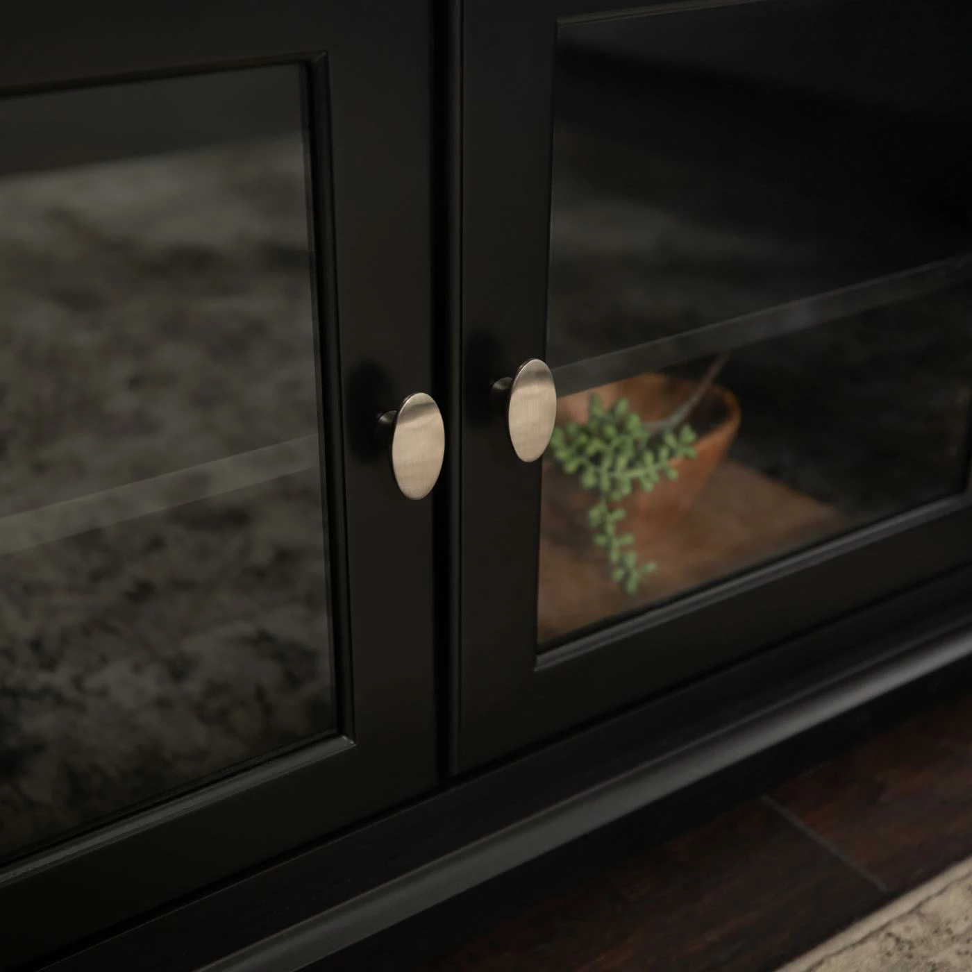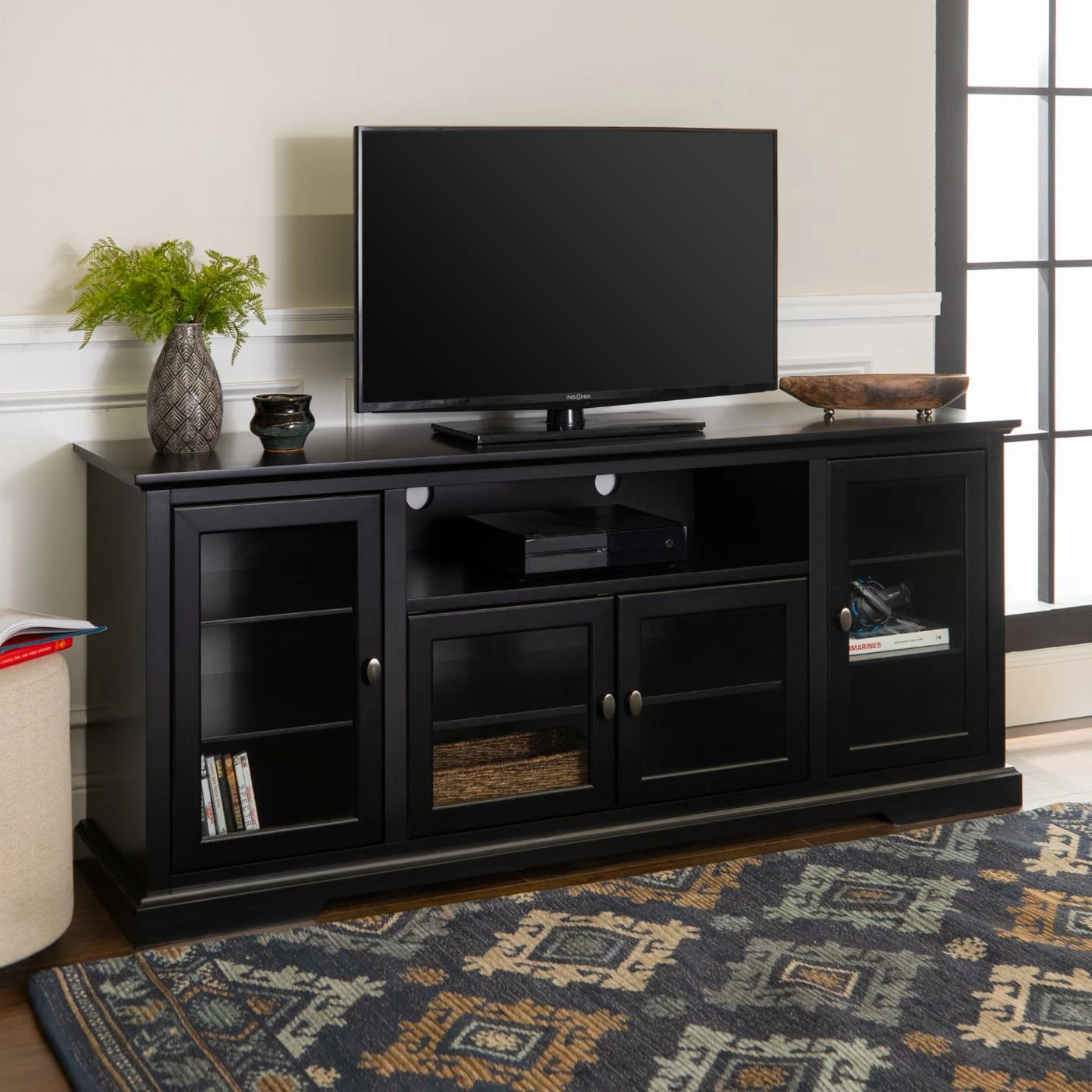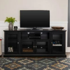 Contemporary style and smart modern conveniences, the Walker Edison 70 in. Wood Highboy TV Stand – Black is the right choice for your home theater. Constructed of durable, quality engineered wood and veneers in a black matte finish. Silver oval knobs open the four wood-framed glass cabinet doors that are remote control-friendly. Media storage lives on the adjustable shelving behind the doors and in the spacious cubby. Cord management holes at the back keep wires tidy. The top of this TV stand accommodates a 78-inch flat panel TV up to 250 pounds. Assembly is required.