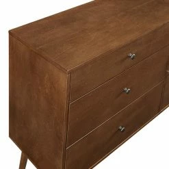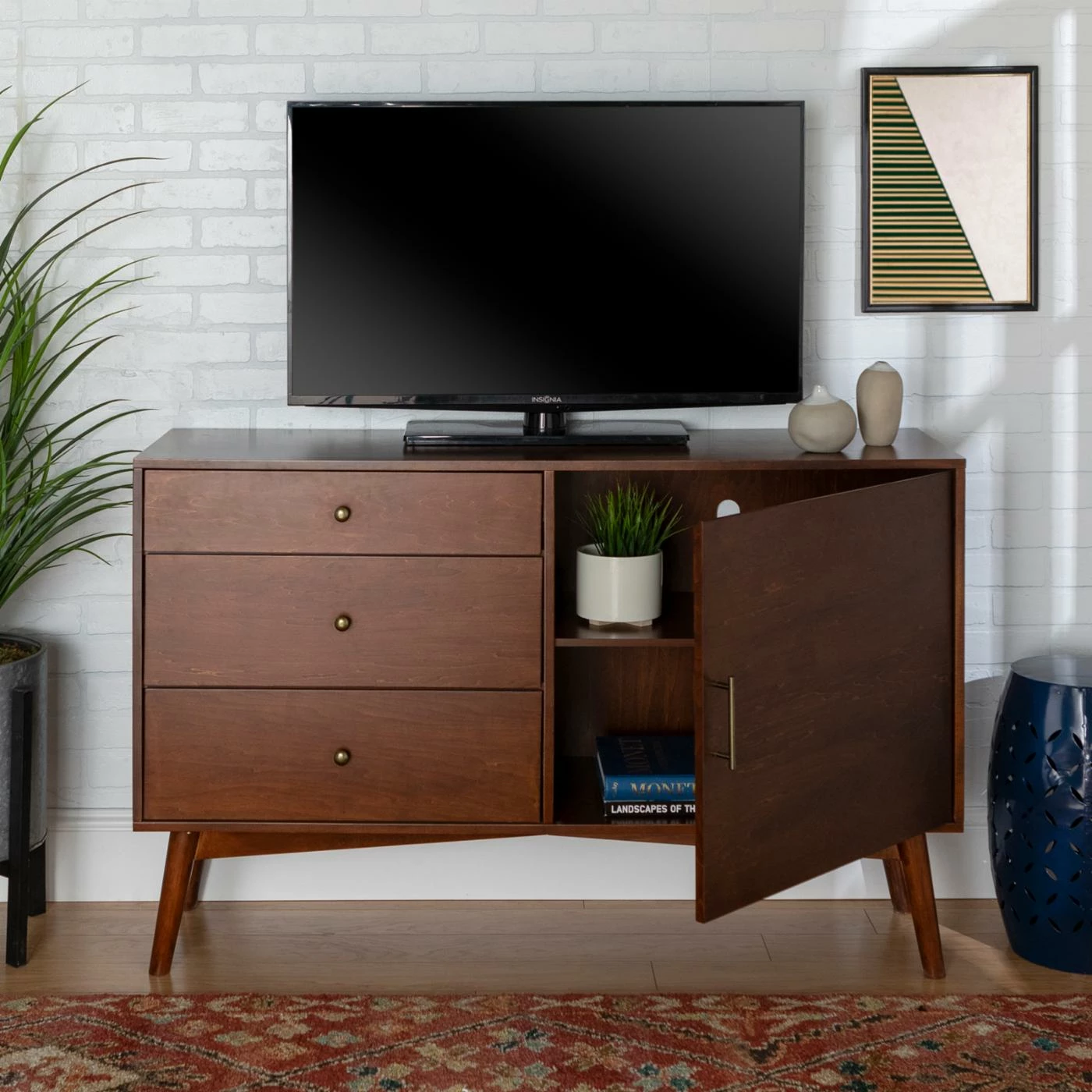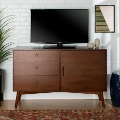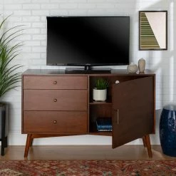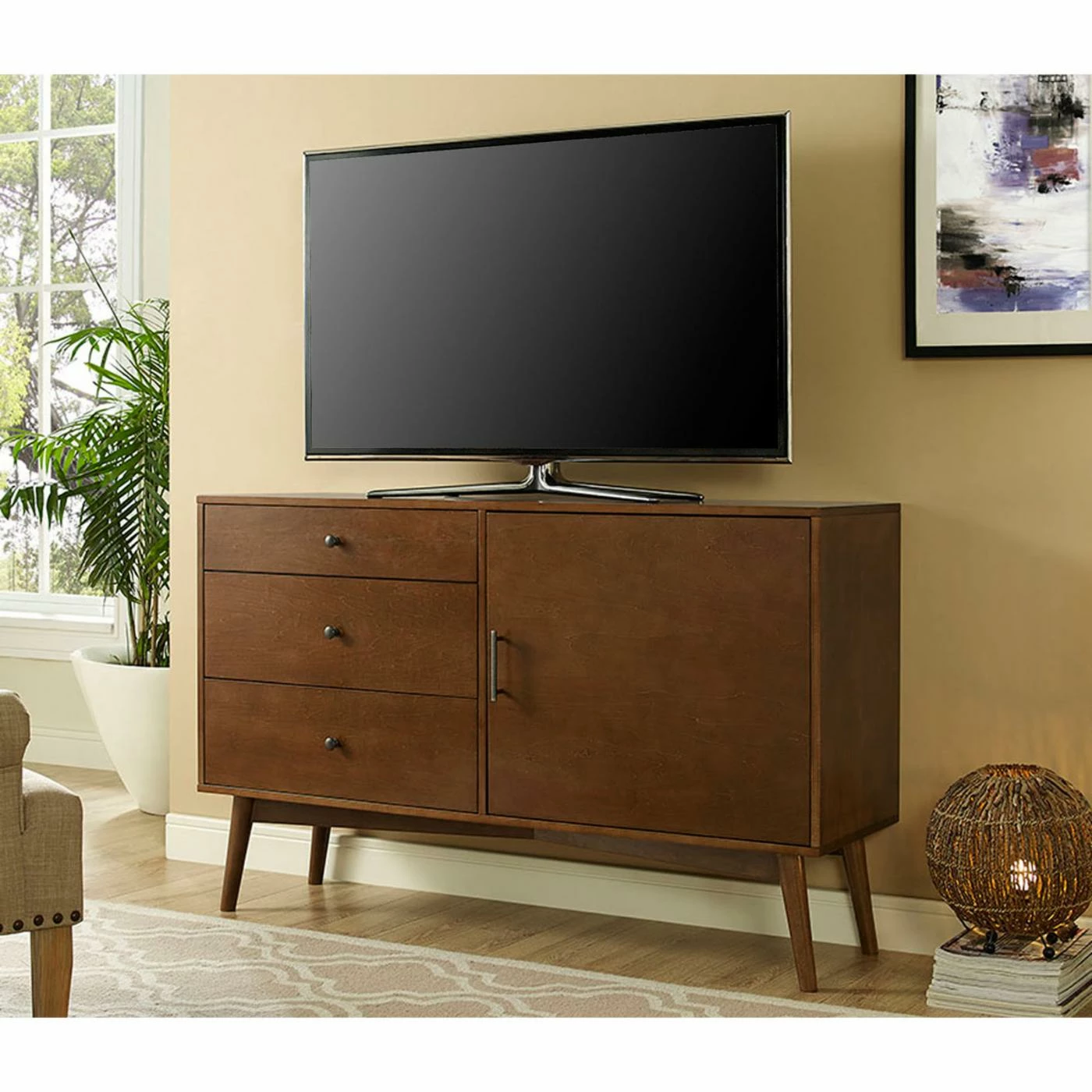 Retro style and modern functionality come together to bring you the Walker Edison angelo:HOME 52 in. Mid-Century TV Console. This brilliant piece is crafted from solid wood and MDF with your choice of finish. It includes three large drawers, a side cabinet, and adjustable shelving inside for media components and more. Cable management is included to avoid clutter.