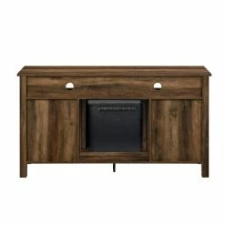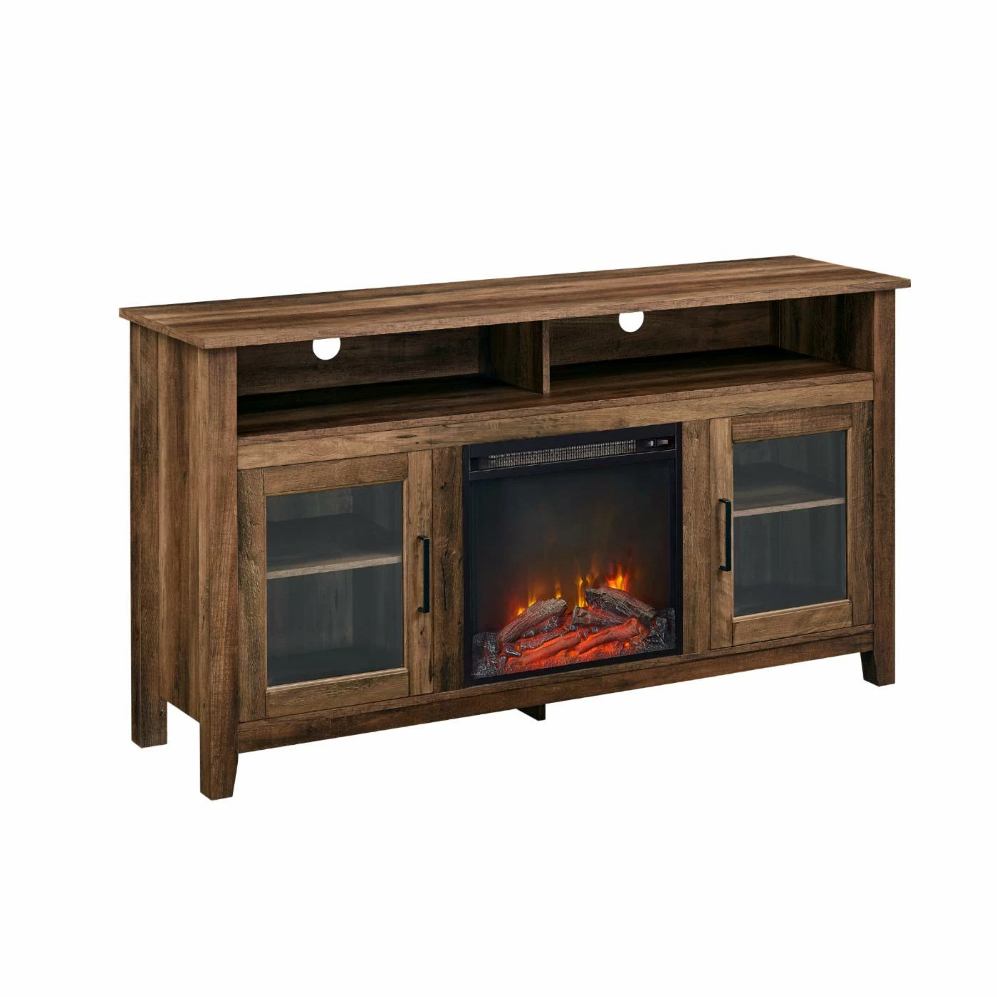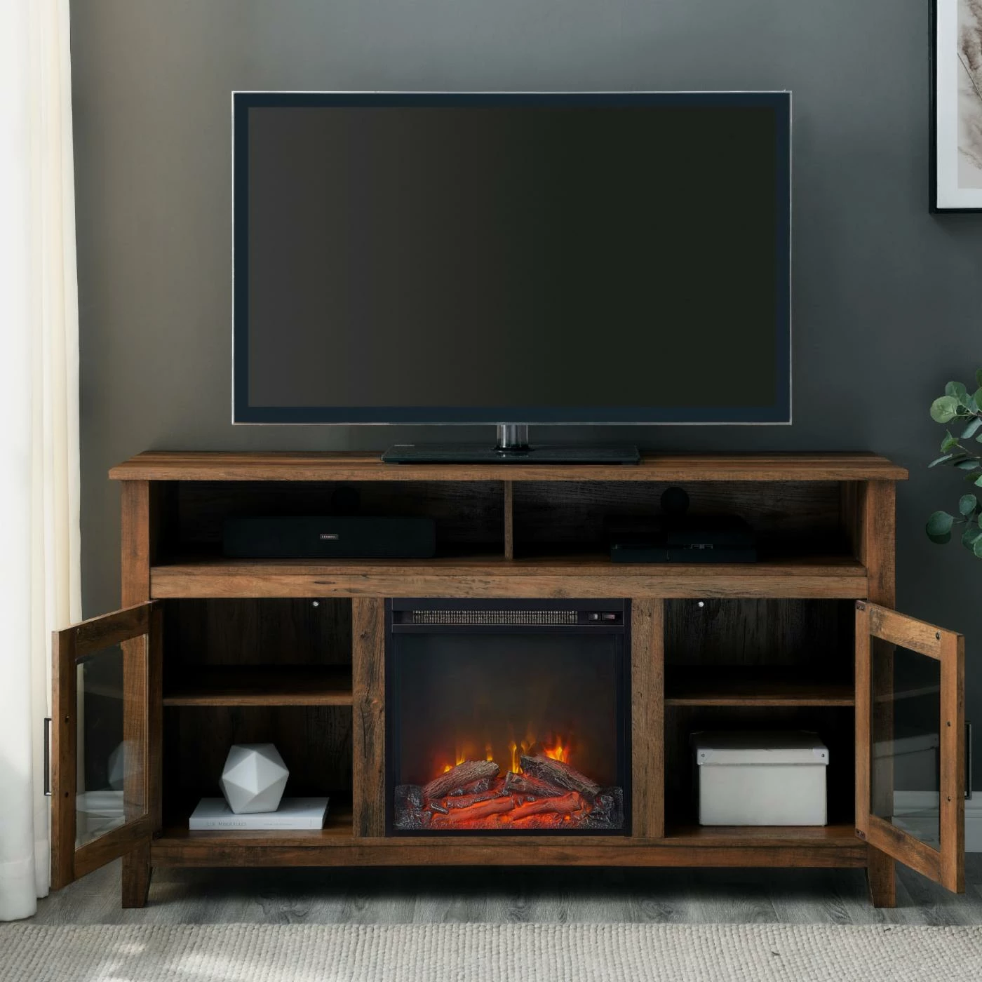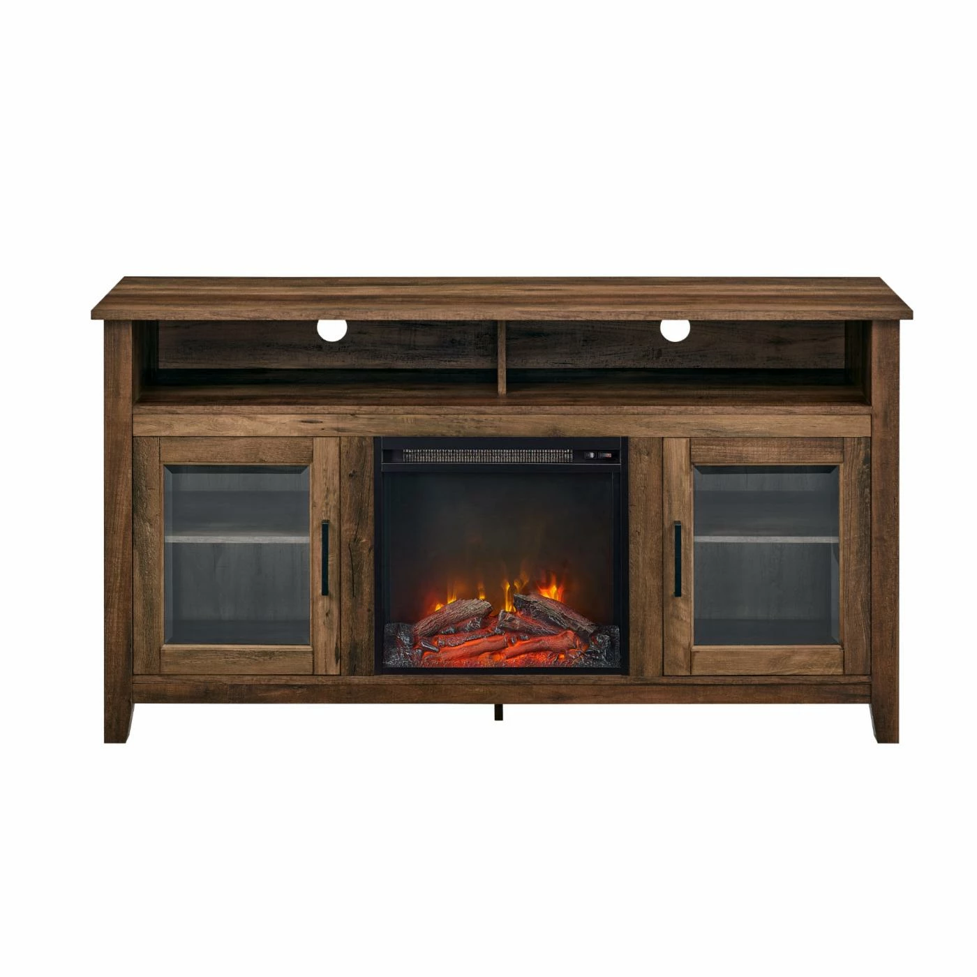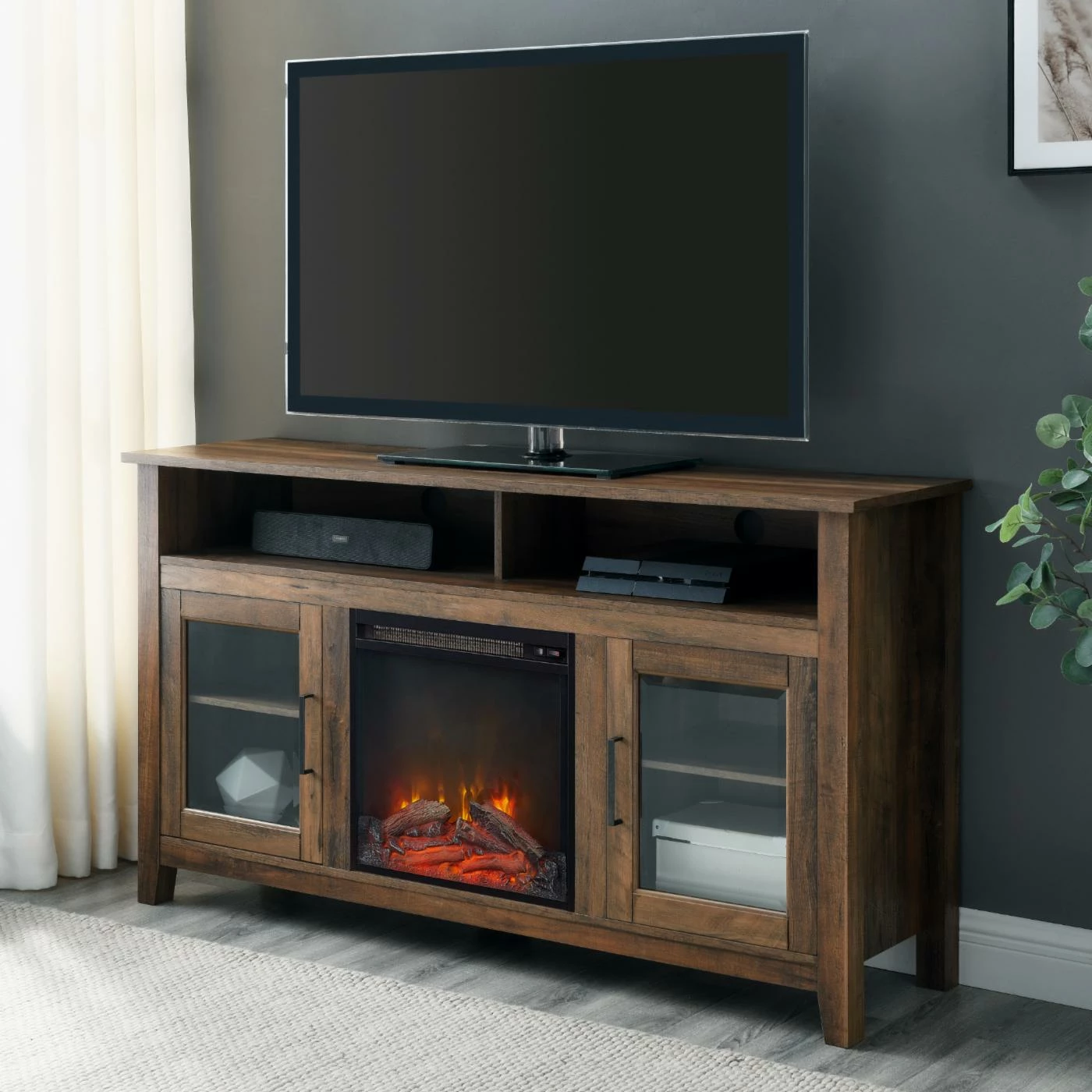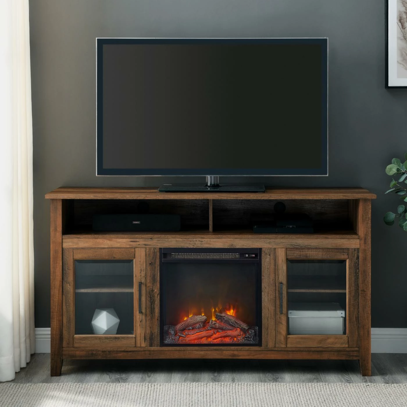 Enjoy movies with your family or entertain guests for the big game with super-stylish and ultra-cozy Walker Edison Highboy Fireplace TV Stand. Constructed from durable wood and laminate, in addition to its rustic design and mesmerizing fireplace the television stand was built to keep your entertainment area organized. This includes an innovative cable management system and an open and closed storage display arrangement plan that includes six shelves for your electronic devices plus movies, music, and books. The unit holds televisions up to 64 inches, and its shelves are adjustable. The fireplace is a simple, plug-in unit (no electrician is required) and the stand ships ready to assemble with step-by-step instructions.