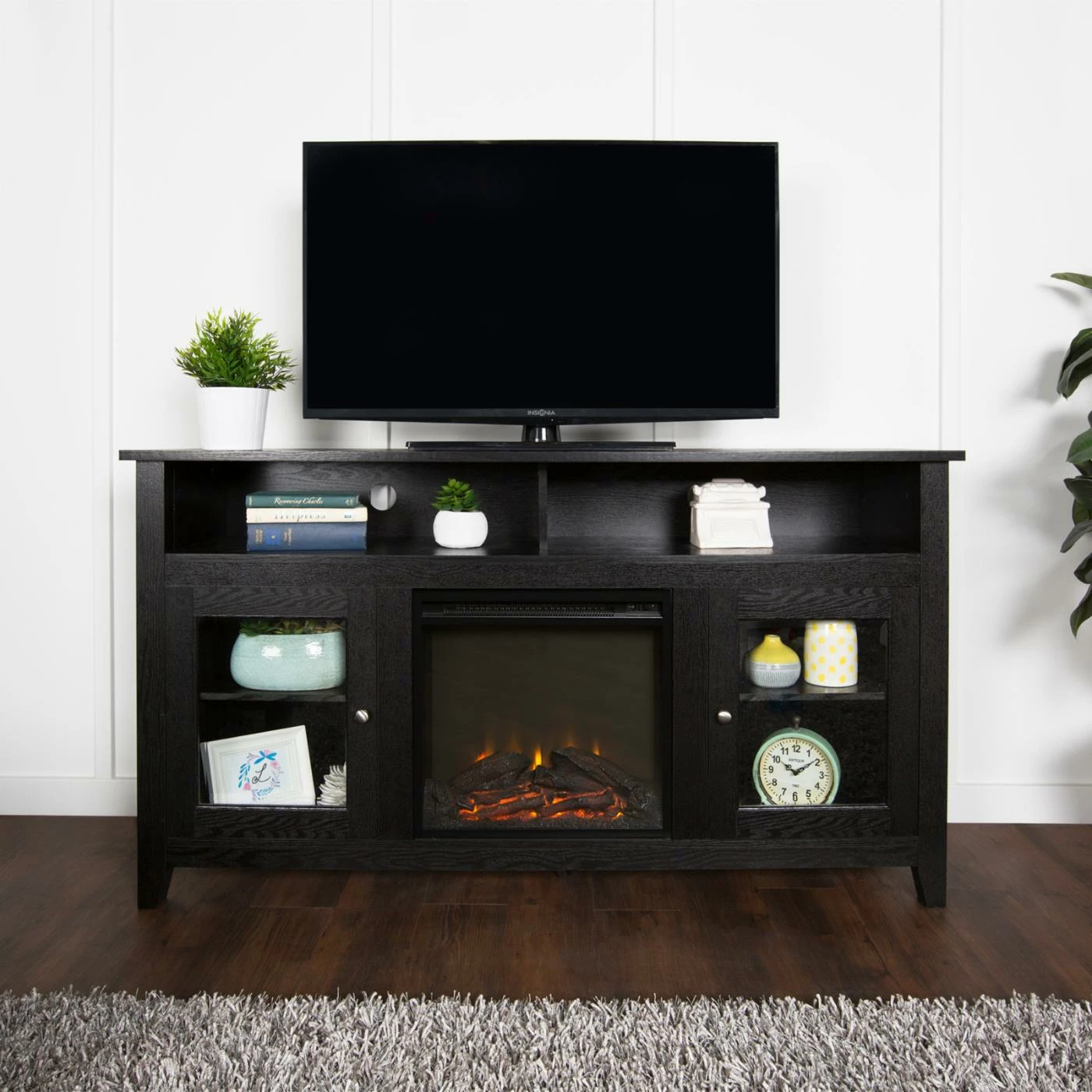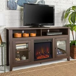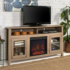 With a fireplace built right in, the Walker Edison Highboy Wood Fireplace TV Stand will be a cozy addition to that chilly TV room. The electric fireplace heats up the room quickly and plugs right into a standard household outlet with no venting required. The TV stand is crafted of high-grade engineered wood (MDF) with durable laminate, and it’s available in a choice of finish. And you’ll adore the storage, which includes two open cubbies with wire management holes and two glass-front doors with one adjustable shelf each. The TV stand arrives ready to assemble with step-by-step instructions.