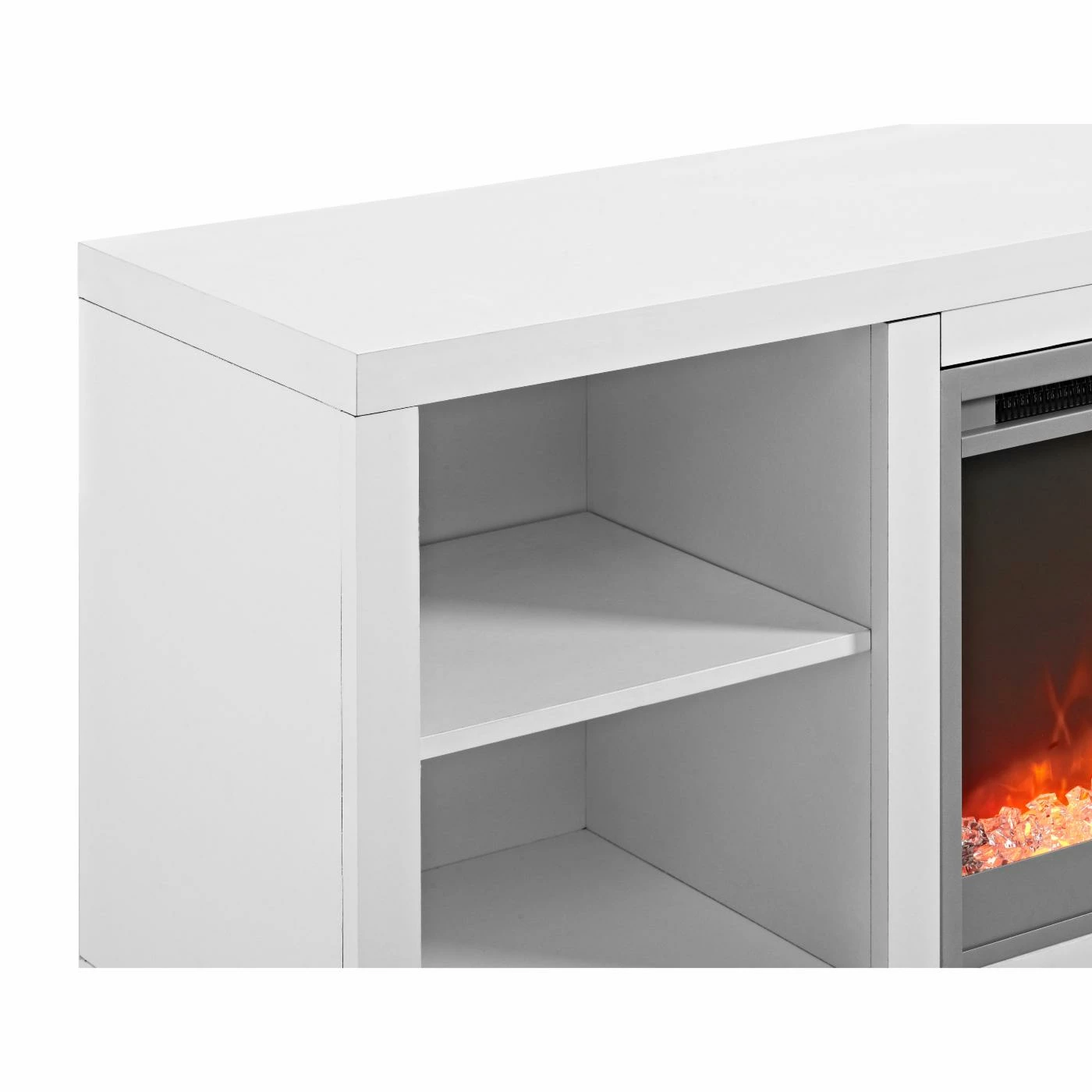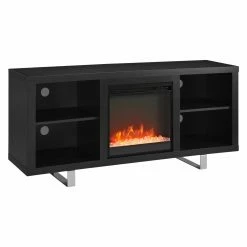 The Walker Edison Simple Modern Fireplace TV Console marries utility and style for a piece that is truly worthy of being at the center of your living room. This TV console is crafted with durable engineered wood that won’t warp or crack. The top of the console will accommodate a flat-panel TV measuring up to 55 inches. Boasting handy open storage compartments with adjustable shelving, this piece has ample storage for DVDs, cable boxes, and gaming consoles. The center compartment offers additional storage, or a dedicated space for an electric fireplace. The optional electric crystal fireplace unit gives you the charm of a fireplace without the dangerous fumes or by products. A metal base supports the design, giving it a strong foundation and a modern style. Choose from available finish options.