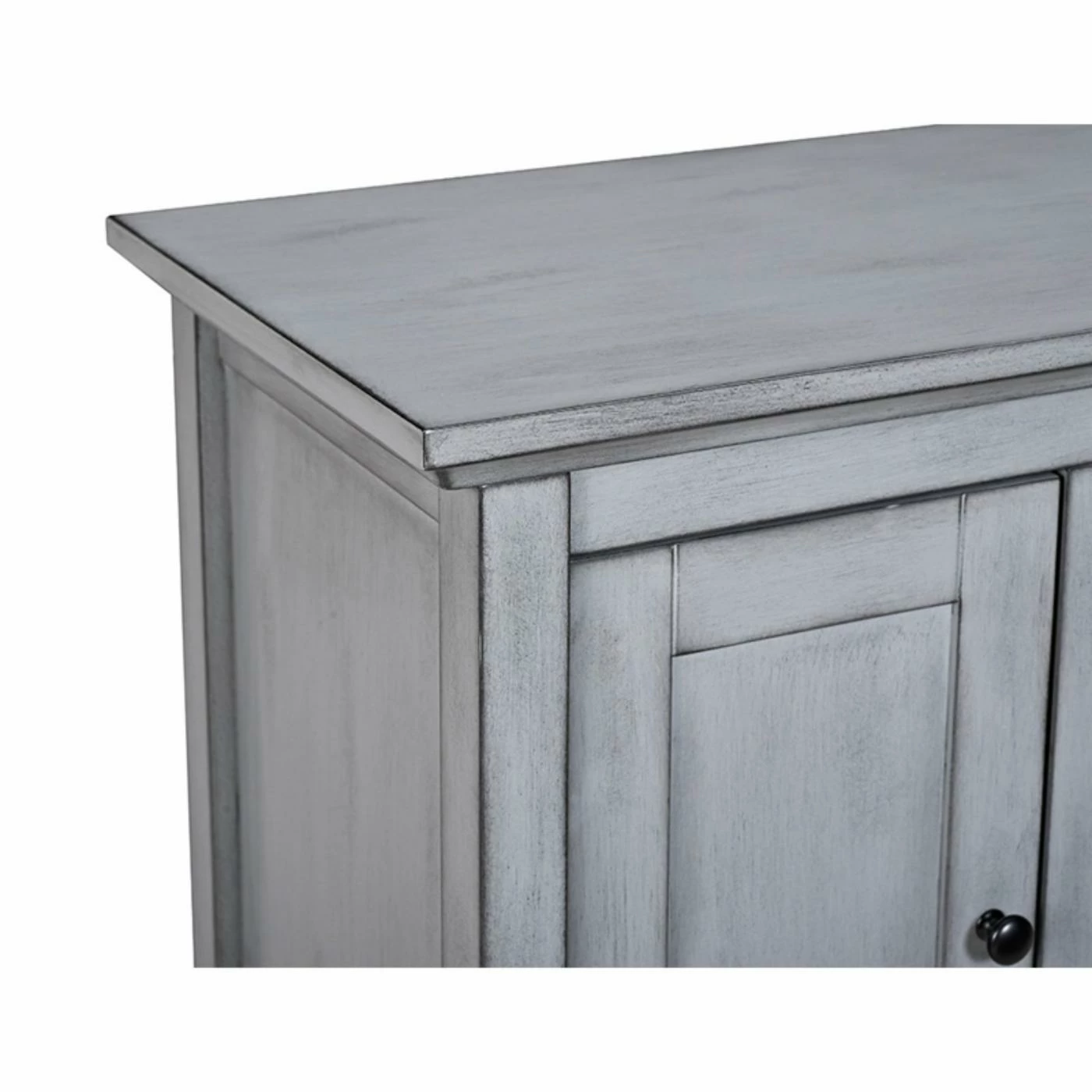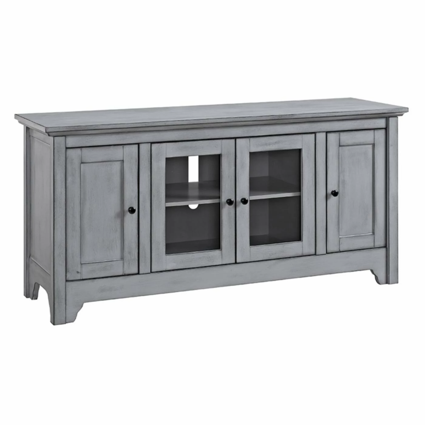 The Walker Edison Wood 52 in. Storage TV Media Console features elegant design, accented by fine detailing. The body of this cabinet is crafted with a durable engineered wood and solid hardwood blend. The front features four paneled doors that cover ample interior storage with adjustable shelves. The center doors have panels of tempered safety glass, making the space within ideal for storing entertainment items or decorative objects. Choose from available lacquered finish options to best suit your space.